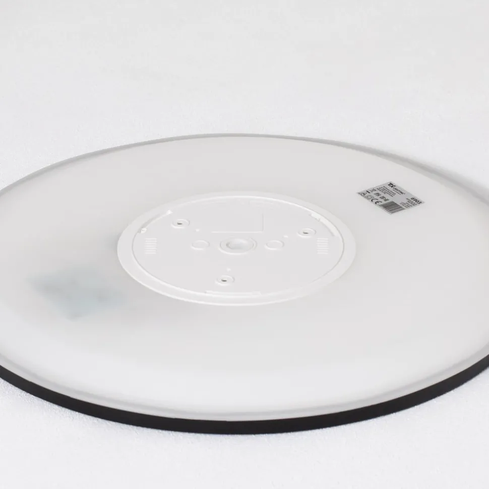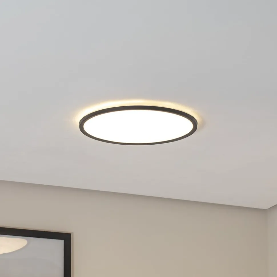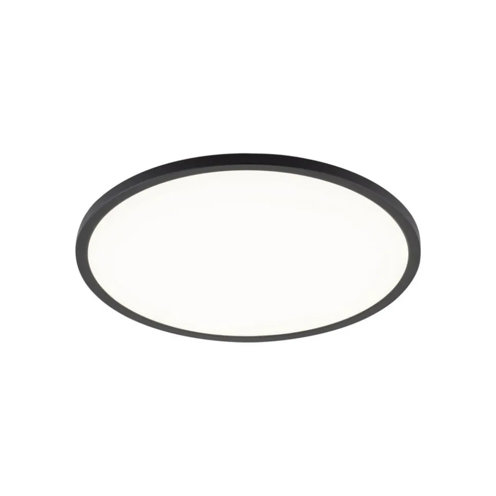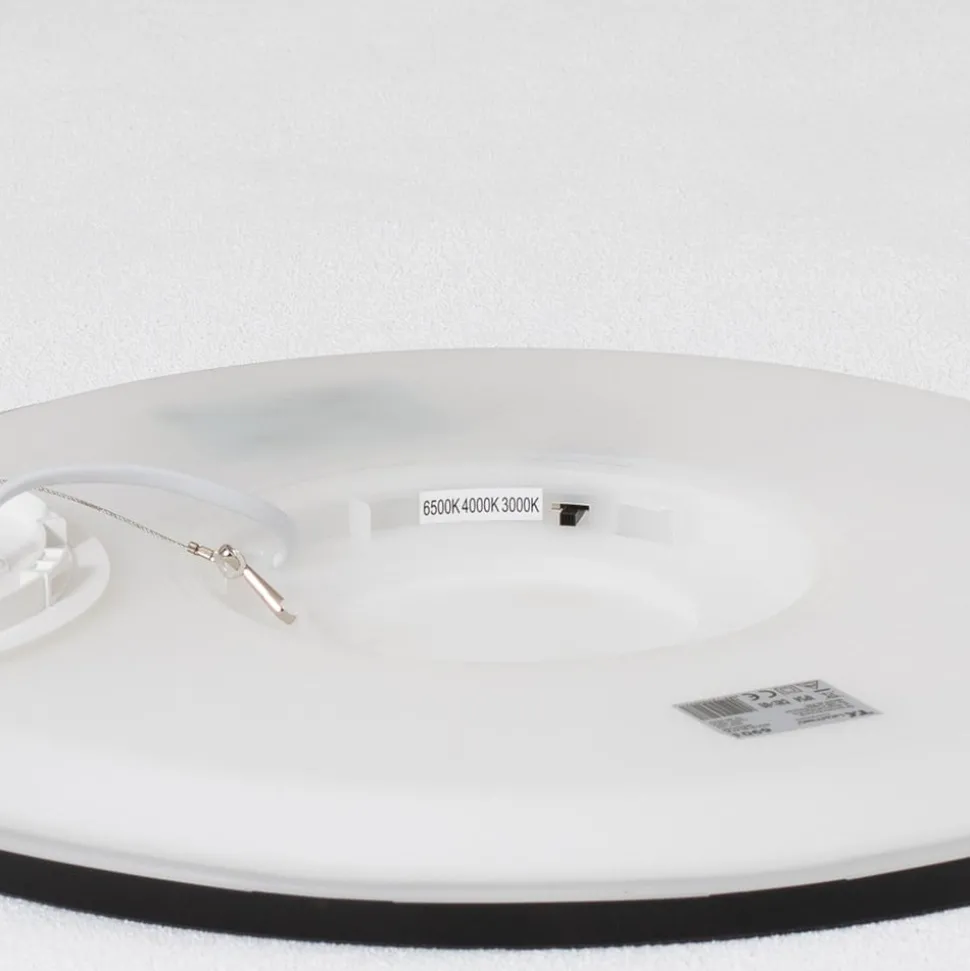 Rundt Aqua LED-panel til baderommet, med svart ramme Aqua LED-taklampen er utformet som et flatt utenpåliggende panel i rund form. Diffusoren er laget av satinert plast som gir et bredt lysbilde, og er omgitt av en svart metallramme. Takket være kapslingsgrad IP54 kan Aqua uten problemer brukes på baderom og vaskerom – Fargetemperaturen på lyset kan stilles inn før idriftsettelse (3 000 K / 4 000 K / 6 500 K) – Dimbar: bare trykk på veggbryteren i rask rekkefølge