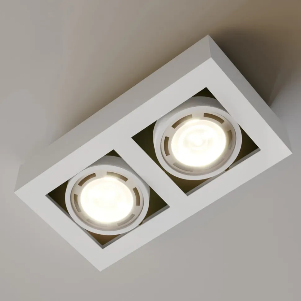 Hvit, 2 lyskilder Ronka taklampe med justerbare innsatser Ronka er en allsidig taklampe med god lysstyrke som også kan dimmes eksternt ved behov. De innvendige innsatsene er justerbare, slik at du bedre kan bestemme lysutslippet. Lysstyrken til lampene er høy, slik at selv 2 lyskilder-versjonen av takspotten gir god rombelysning, men flere lyskilder kan selvfølgelig integreres i belysningskonseptet, spesielt i større rom eller oppholdsrom som ofte krever ekstra belysning. Tilkoblingsklemmen av høy kvalitet på den kantete, hvite downlighten er skrueløs, slik at enkelt-, fin- og flertrådede ledere kan kobles til raskt og sikkert, og fremfor alt uten verktøy. Sammen med muligheten for gjennomgående kabling er dette en betydelig fordel, spesielt i den kommersielle sektoren – Passer til GU10-pærer med ES111-design