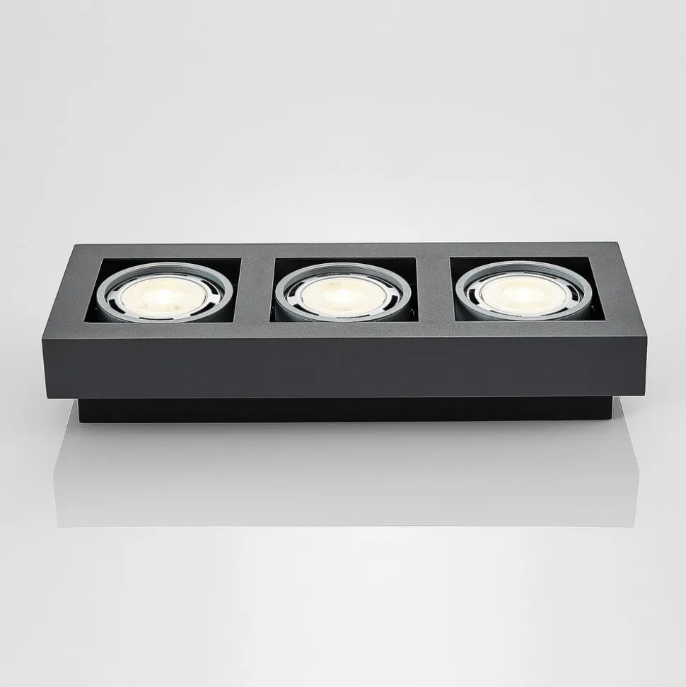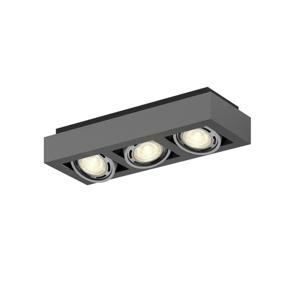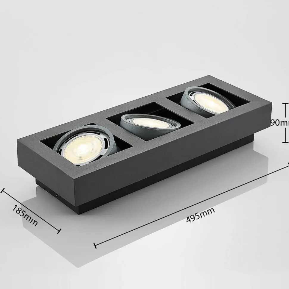 Mørkegrå Ronka taklampe for tre dimbare LED-taklamper Ronka passer både i private hjem og forretningslokaler, og er en taklampe som skaper et sterkt lys og kan brukes godt som hovedbelysning. De tre innsatsene i det mørkegrå, kantete huset kan enkelt svinges, noe som betyr at lysbildet kan justeres bedre. Egnede GU10-lysarmaturer kan kjøpes separat via tilbehøret. Den skruefrie tilkoblingsklemmen er svært nyttig for tilkobling, slik at kablene kan kobles til raskt, sikkert og uten verktøy. Designet på downlighten er både moderne og diskret og er fremfor alt funksjonelt. Lampen kan derfor enkelt kombineres med ulike stiler – for GU10-pærer med ES111-design (maks. 20 W)