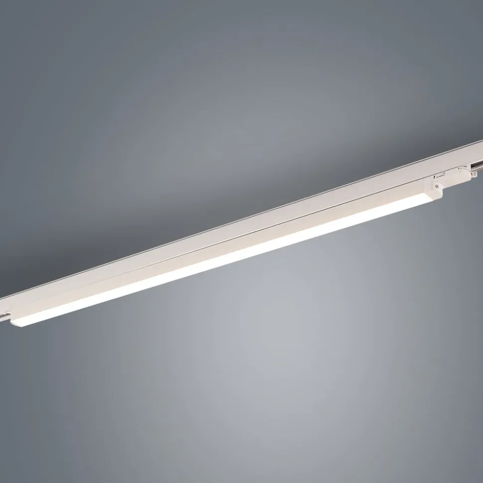Harlow langstrakt LED-armatur for 3-fase skinne med hvit overflate Harlow er designet for bruk på et 3-fase skinnesystem og kan derfor brukes både privat og kommersielt. Det er en lineær LED-armatur som har god effektivitet, lyser sterkt og gir mulighet til å belyse omgivelsene på store flater. Avskjermingen over LED-lampene er hvit, slik at lyset sendes ut mykt og jevnt. Dette gjør Harlow til en armatur for et bredt spekter av bruksområder, der skinnesystemer generelt kjennetegnes av at de kan brukes til å skape en individuell belysningsløsning ved å montere ulike skinnespotter med ulike egenskaper og fordeler på en skinne. Visuelt er Harlow LED-skinnespot med sin hvite overflate en svært diskret lyskilde som understreker sin oppgave med å produsere sterkt lys. – SDCM < 4 – UGR 29,9 – for drift på 3-fase skinne