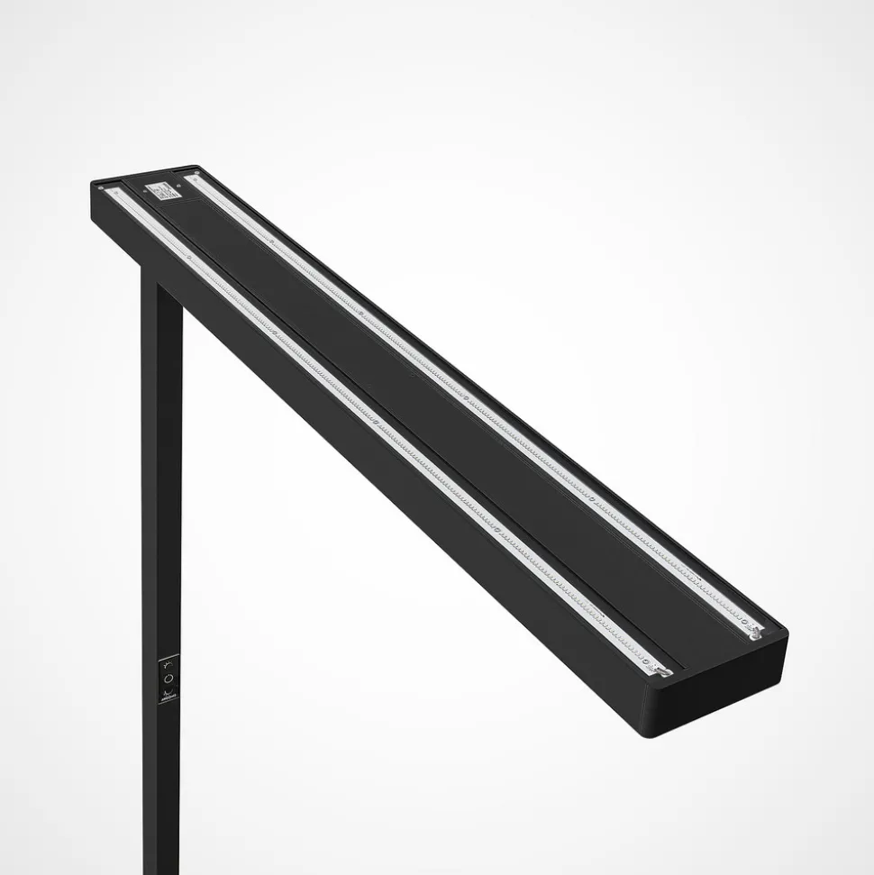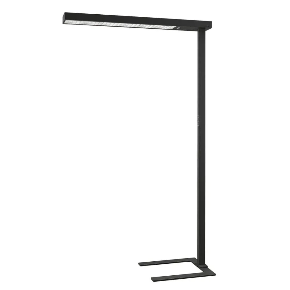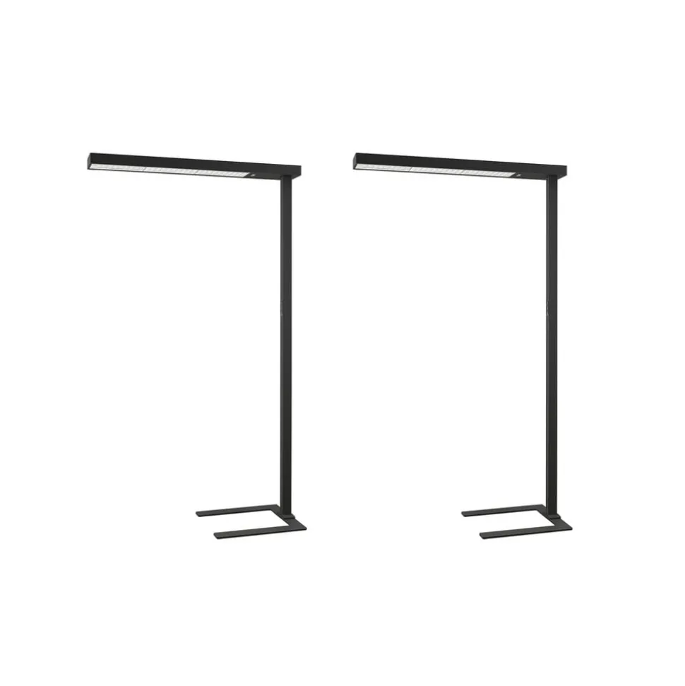 Susi LED-gulvlampe til kontor i svart med dimmer, U-fot, dagslyssensor og bevegelsessensor for optimalt arbeid ved PC-arbeidsplassen, i sett med 2 stk Lyset fra Susi gulvlampe til kontor er i stor grad indirekte og svært behagelig med en blendingsfri effekt, slik at du kan konsentrere deg om PC-arbeidet i lang tid, noe som også begunstiges av det flimmerfrie lyset som lampen produserer. Lyset er universalhvit, ideelt for arbeid ved datamaskinen. Foten på LED-gulvlampen er U-formet, slik at den enkelt kan plasseres rundt et bordbein. Takket være en dagslyssensor tilpasser lysstyrken seg automatisk til omgivelseslyset og kan også styres manuelt via en dimmer på berøringsplaten hvis det er nødvendig. Bevegelsessensoren sørger også for at lyset slår seg av hvis arbeidsstasjonen ikke har vært i bruk over en lengre periode (mer enn 30 minutter). Leveres i et praktisk sett med 2 stk. Tekniske data: – flimmerfritt lys – U-formet sokkel – inkl. bevegelsessensor (rekkevidde 3,5 m, registreringsvinkel 85°) – med dagslyssensor – med dimmer – spesielt høy andel indirekte lys – for skjermarbeidsplasser (UGR > 11)