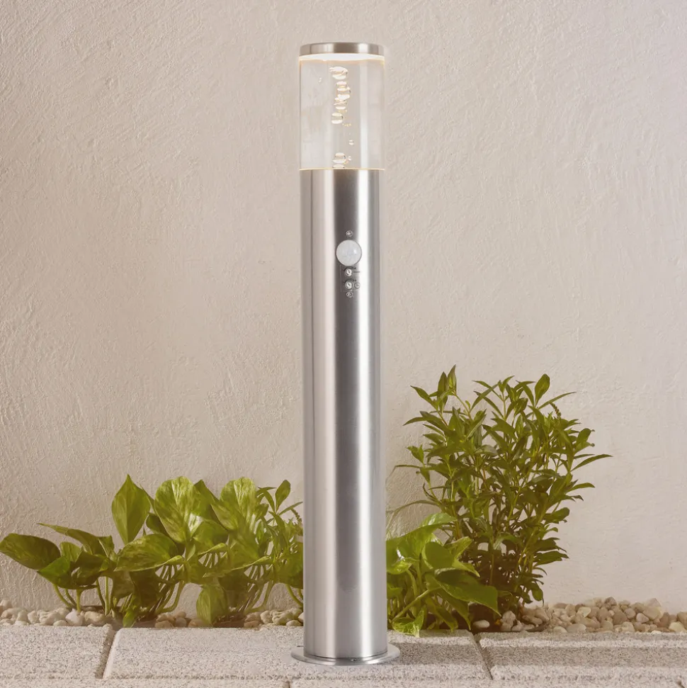 Sylindrisk bevegelsessensor Belen med LED Belen sokkellampe er sylindrisk fra topp til bunn, noe som gir den et svært moderne utseende. I tillegg er det lagt inn dekorative luftbobler i det klare armaturhuset av akryl, som ikke bare er dekorative, men som også har en effektiv effekt på lysvirkningen. Hvis du heller ikke vil gå glipp av de funksjonelle aspektene, vil du bli glad for å vite at sokkellampen Belen er utstyrt med en bevegelsessensor som er plassert på den øvre delen av rammen i rustfritt stål. Denne sensoren gjør at utelampen slår seg på automatisk så snart det oppdages mennesker i nærheten. De trenger bare å befinne seg i en registreringsvinkel på 90° og ha en rekkevidde på 2-6 meter (justerbar) fra armaturen. Belen lyser deretter i minst 5 sekunder og maksimalt 6 minutter, og den spesifikke varigheten kan stilles inn av brukeren, ettersom den er justerbar.