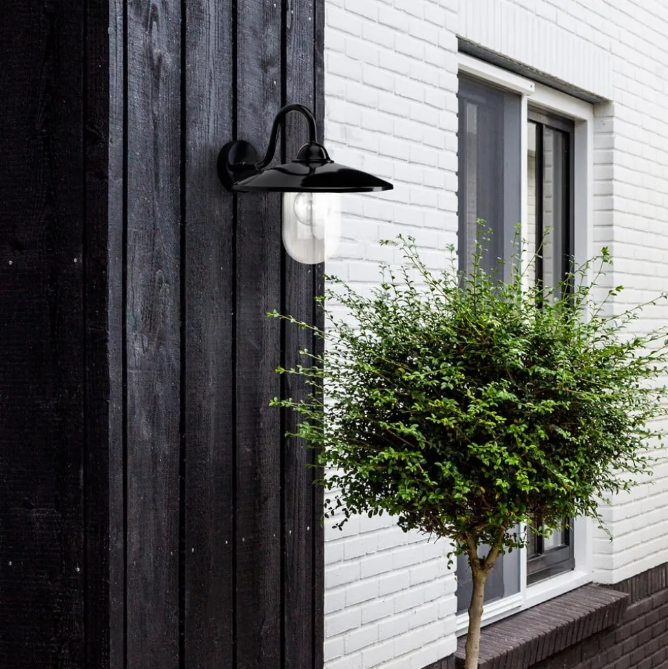 Glamorøs, svart BRIG utendørs vegglampe for hjem og hage Den klassiske, svarte BRIG utendørs vegglampen lyser opp inngangspartier eller uteplasser på lang avstand. Den buede metallrammen har en blank, svart finish, mens den klare glasskjermen lar lyset skinne klart og uhindret. Passer til vanlige lyspærer, sparepærer eller LED-lamper.
