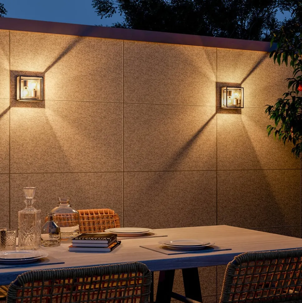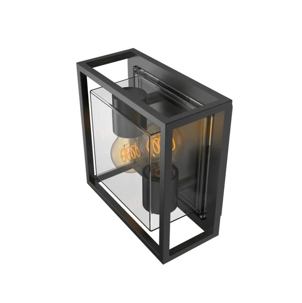 Moderne utendørs vegglampe i svart kubusform med to stikkontakter Denne utendørs vegglampen er en stilig lyskilde som gjør seg godt i moderne miljøer. En nedadvendt E27-sokkel og en oppadvendt E27-sokkel er plassert ved siden av hverandre bak et klart polykarbonatdeksel. Veggplaten og den åpne, kubiske ytterkonstruksjonen er laget av aluminium og har en svart finish – Kapslingsgrad: IP44