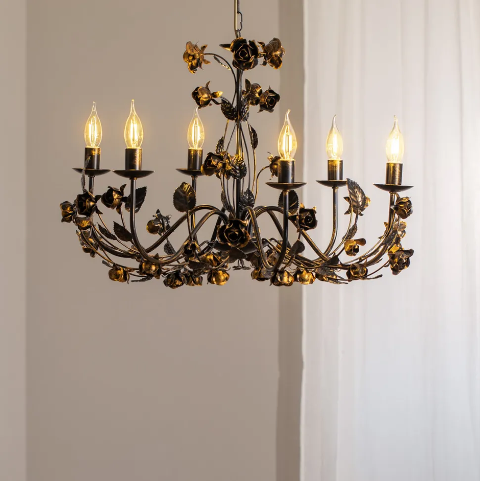 Carolina lysekrone: eleganse og florentinsk stil i bronse Carolina lysekrone kombinerer florentinsk eleganse med robust jern og en sofistikert bronsefarge. Med sine seks lys gir den en imponerende lyseffekt som skaper en stilfull atmosfære i både stue og spisestue. Den florentinske stilen gir lysekronen en tidløs ynde som fremhever ethvert rom. Carolina lysekrone er produsert i Europa og merket «Made in Italy», og står for håndverk av høy kvalitet og eksklusive materialer. Muligheten til å dimme via en ekstern dimmer gir fleksibilitet i lysdesignet for å skape ønsket stemning. Et mesterverk som kombinerer tradisjon og funksjonalitet i en harmonisk design.
