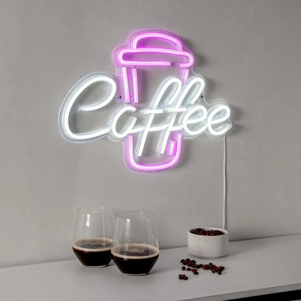Coffee LED-vegglampe for fargerik stemningsbelysning Coffee LED-vegglampen har et trendy motiv og brukes til interiørbelysning. Fargerike lysdioder er integrert i et gjennomsiktig pleksiglasspanel og får strøm via en USB-kabel (uten plug-in-transformator).