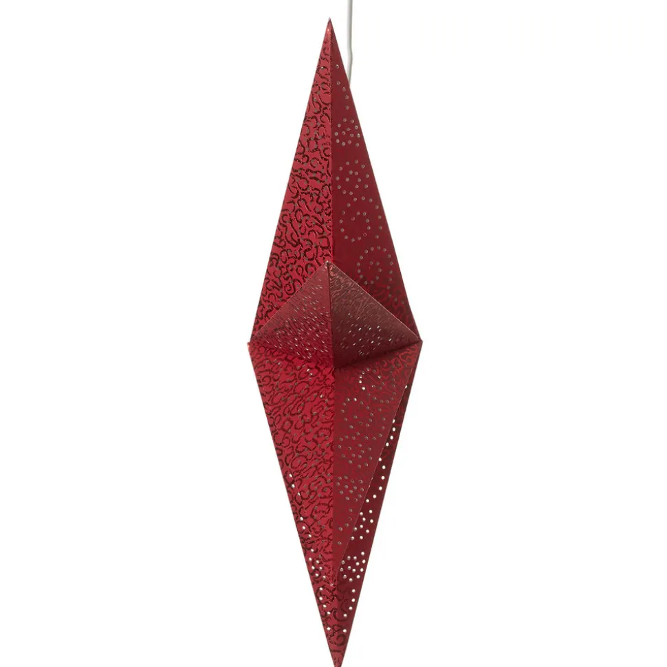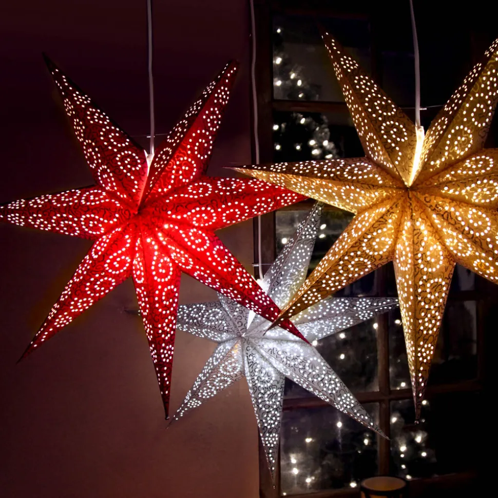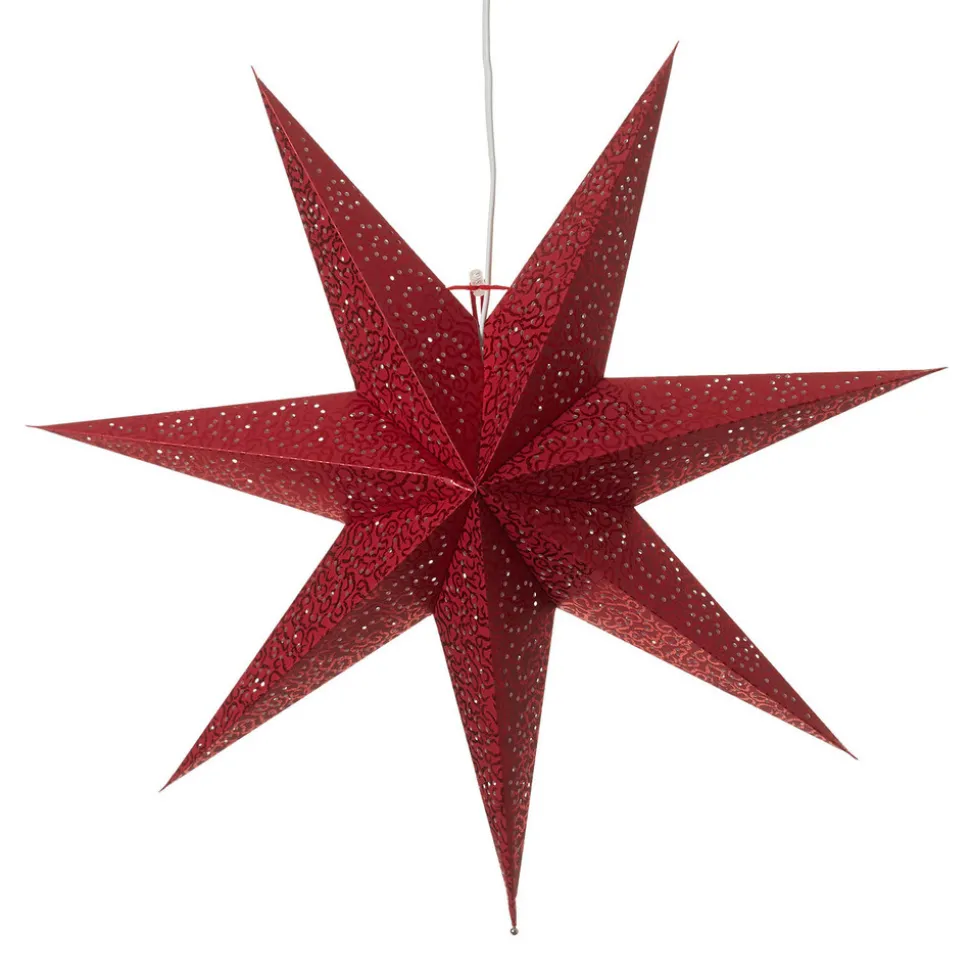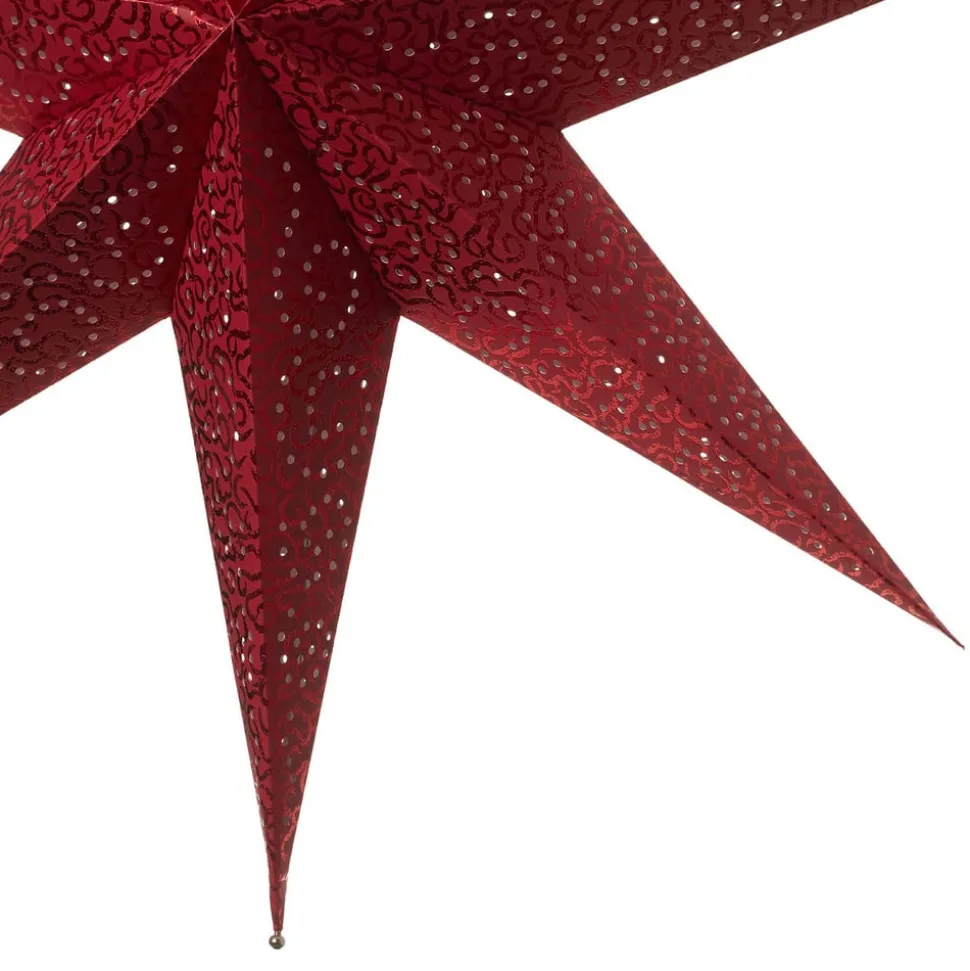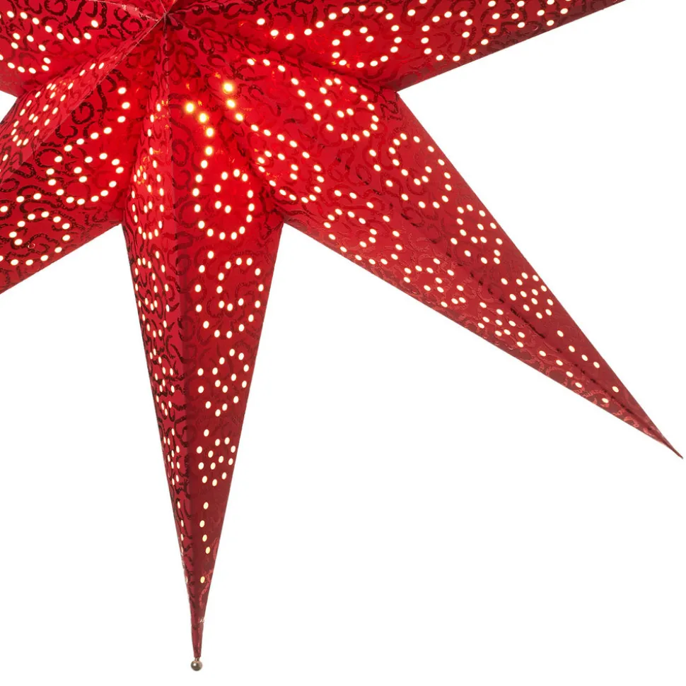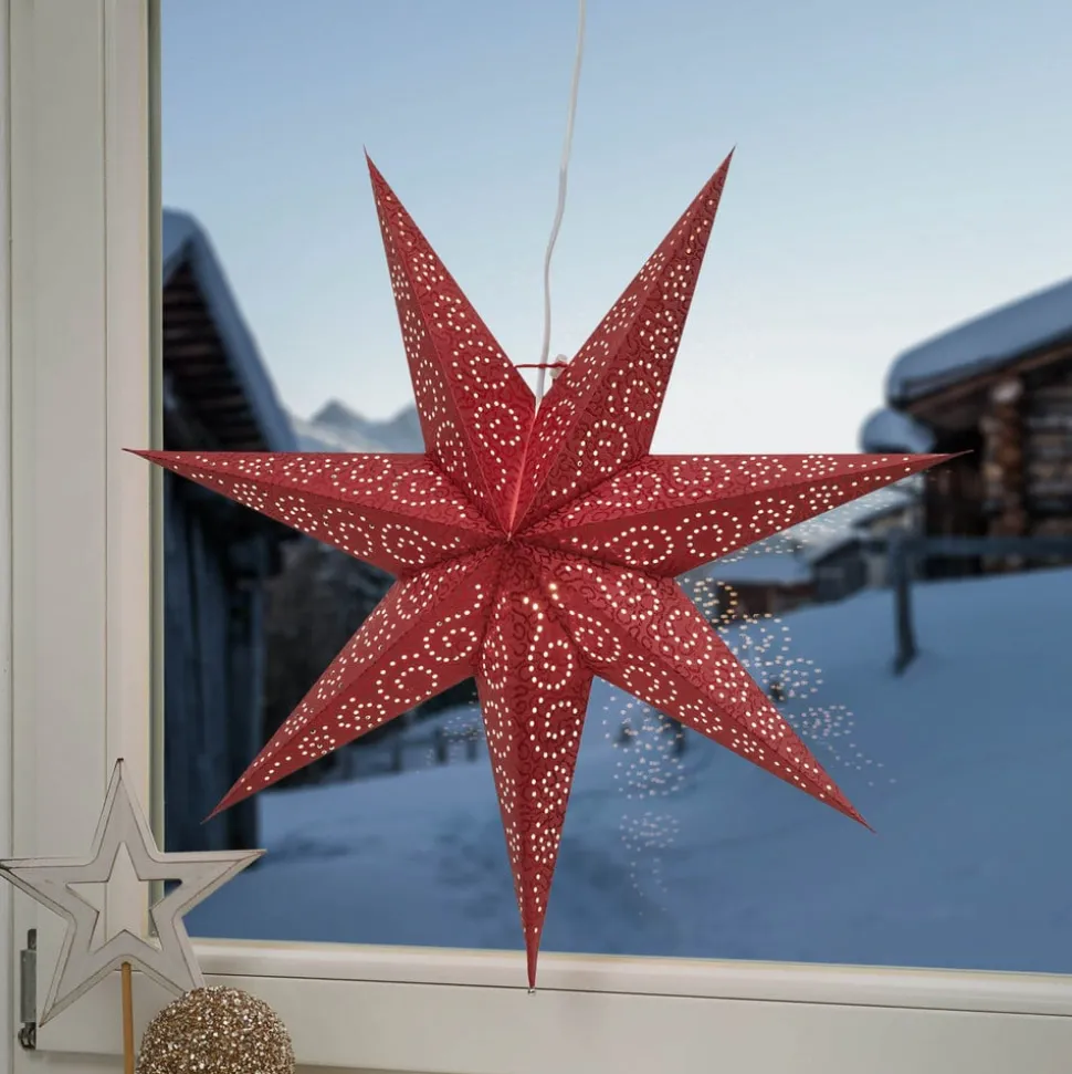 Denne stjernen i rødt papir med en diameter på 60 cm er dekorert med et iøynefallende hullmønster og leveres komplett med en 3,5 meter lang plugg. Den antikke papirstjernen er ikke bare attraktiv ved juletider, når den kan beundres på lang avstand som en lysende vindusdekorasjon. Den pynter hvert rom hele året med sitt flotte utseende.