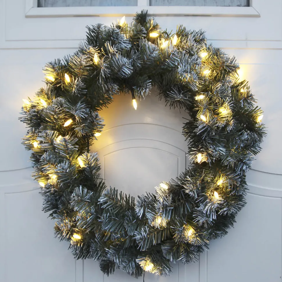 Edmonton LED-krans – en stemningsfull dekorasjon for utendørsarealer Edmonton LED-krans, som er opplyst av 30 LED-lys fra Pisello, forvandler dører eller husfasader på en fortryllende måte med sin vinter- og juledekorasjon. Den enkle og vakre grønne kransen med snødekorasjon kan kombineres med en rekke ulike stilarter. Den nødvendige utendørstransformatoren er allerede inkludert i leveransen.