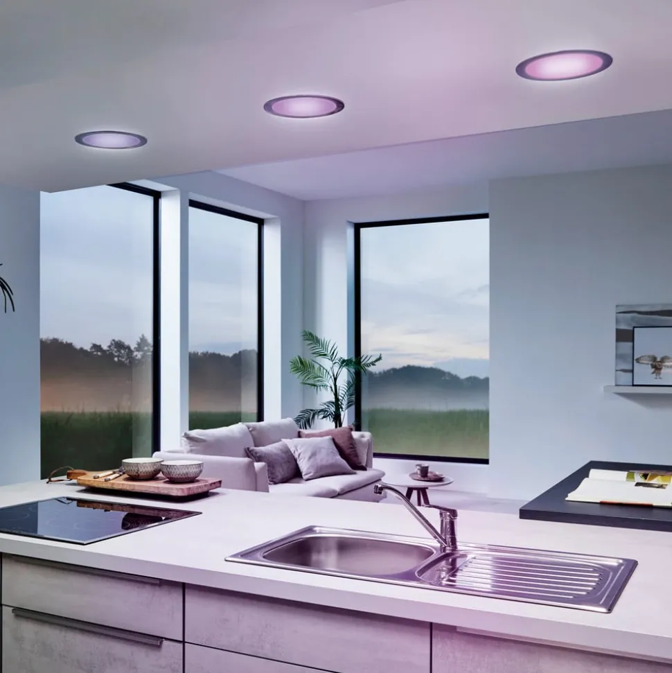 Kan styres via app – Fueva Connect innfelt LED-spotlight i matt nikkel Fueva Connect er en innfelt LED-spotlight som kan brukes til å skape fleksibel rombelysning. Den kan styres på en moderne måte ved hjelp av en app på smarttelefon eller nettbrett, eller alternativt med en fjernkontroll som kan bestilles som tilbehør. For Bluetooth-styring via nettbrett eller smarttelefon er det bare å laste ned gratisappen som er tilgjengelig for iOS og Android. Det kreves ikke noe annet tilbehør. Lyset i hjemmet kan også styres på reise eller ferie, for eksempel for å simulere tilstedeværelse. Innstillingene lagres sikkert og kryptert i en sky og er tilgjengelige når som helst. Mulighetene for lysdesign er nesten ubegrensede. Som lysfarge kan man velge én av 16 millioner fargenyanser eller hvitt lys i spennet fra varmhvit (2700 K) til dagslys (6500 K). Lysstyrken til hver lysfarge kan dimmes trinnløst. Fargevekslinger kan stilles inn i ulike hastigheter, og det er også mulig å hente frem spesiallagde eller forhåndsinnstilte lysscenarier, for eksempel en soloppgang for å vekke deg på soverommet. Fueva Connect LED innfelt spot passer inn i ethvert interiør og kan brukes til å belyse et helt rom hvis det er installert flere innfelte spots. For å styre lyset uten smarttelefon følger det med en fjernkontroll som kan brukes til å gjøre nesten de samme innstillingene.