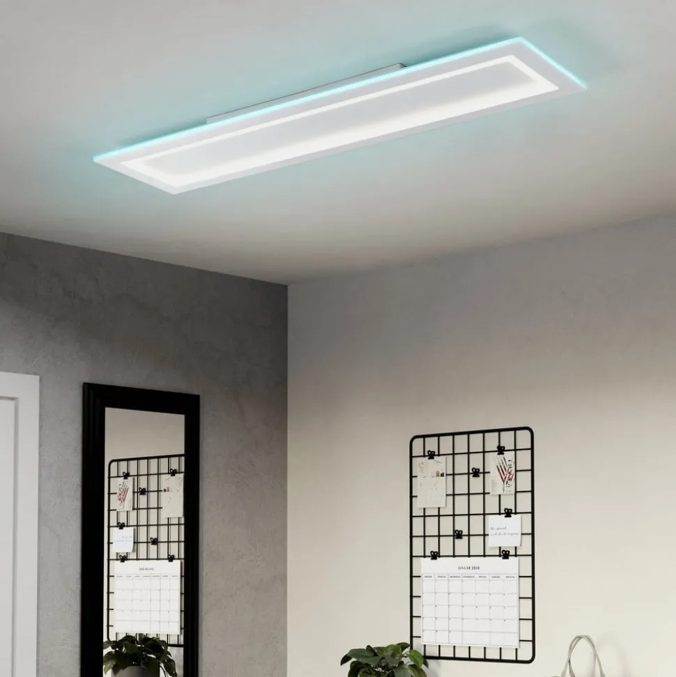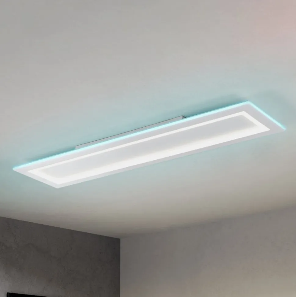 LED-taklampe Padrogiano-Z EGLO Connect, rektangulær, RGB, CCT Den rektangulære LED-taklampen Padrogiano-Z fra connect.Z smart home-serien fra EGLO består av hvitt metall og en plastramme på toppen. De integrerte LED-lampene gir behagelig lys etter ønske, for takket være RGB- og CCT-fargevekslende lys kan man velge både hvitt lys i området fra varmhvit til dagslys hvit (indre ring) og farget lys fra en rekke sterke farger (ytre ring). Både den ytre og den indre akrylringen kan slås av og på og dimmes separat. Taklampen styres via en gratis app (AwoX Home Control) og gir tilgang til flere praktiske funksjoner som dimmer, timer, tilstedeværelsessimulering og mye mer. LED-panelet styres via Bluetooth og ZigBee 3.0 og kan også styres via kompatible stemmeassistenter. Alternativt kan den smarte taklampen også styres med en fjernkontroll, som er tilgjengelig separat som tilbehør. Den rektangulære lampen passer inn i mange interiørstiler og tilbyr variabel, stemningsfull belysning for alle rom og aktiviteter.