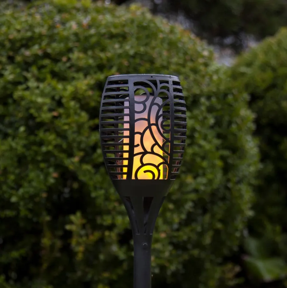 Allsidig Flame LED-solcellelampe med integrert skumringssensor Flame LED-solcellelampen drives av solenergi og kan derfor brukes fleksibelt utendørs. Den kan enkelt brukes som veilampe med jordspyd, som vegglampe med fakkellys-look eller som en liten bordlampe. Takket være den integrerte flammeeffekten skaper lyset en hyggelig atmosfære i hagen, på balkongen eller terrassen. Skumringssensoren slår lyset på automatisk i skumringen – Belysningstid ca. 5 timer – Med flammeeffekt