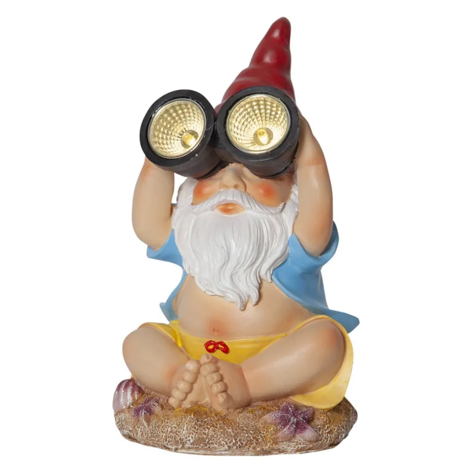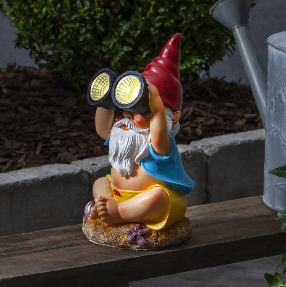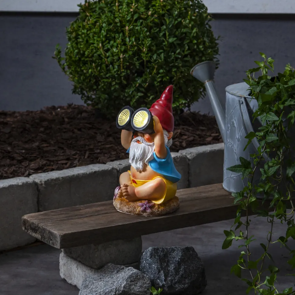 Solcellelampe Gnomy – stjernekikker med kikkert Gnomy er en hagegnom som sitter med bena i kors og ser opp på himmelen med kikkerten sin. Gnomy får enhver observatør til å trekke på smilebåndet med sin morsomme design. Lysdiodene i dekorasjonsbelysningen er innebygd i kikkerten, og takket være den integrerte solcellemodulen og skumringssensoren lyser de opp av seg selv når mørket faller på. Den ser spesielt dekorativ ut når den kombineres med flere Gnomy-lamper eller andre utendørs dekorasjoner for å skape et lysende ensemble.