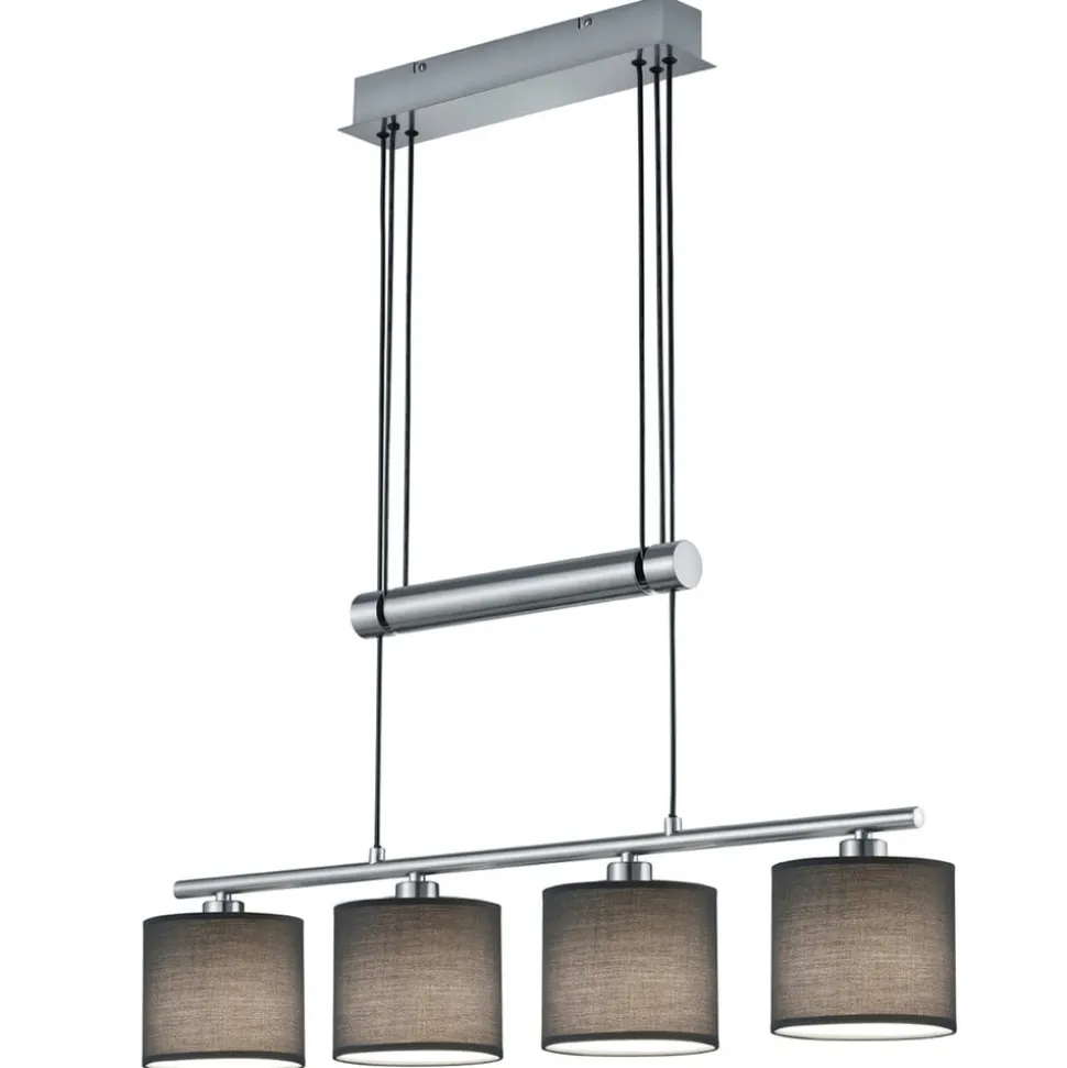 Garda 4 lyskilder pendellampe – høydejusterbar opp til 150 cm Garda 4 lyskilder pendellampe er ideell som bordbelysning i en moderne spisestue eller stue: Fire grå stoffskjermer er spredt over en lengde på 77 cm, og gir direkte nedadrettet lys for en homogen lysfordeling. Lyset trenger også forsiktig gjennom stoffet hele veien rundt, noe som skaper en veldig koselig atmosfære. Høyden på Garda hengelampe kan justeres til ønsket høyde mellom 90 cm og 150 cm ved hjelp av et håndtak.
