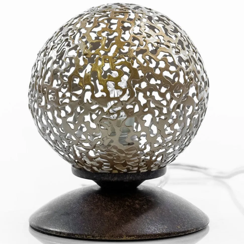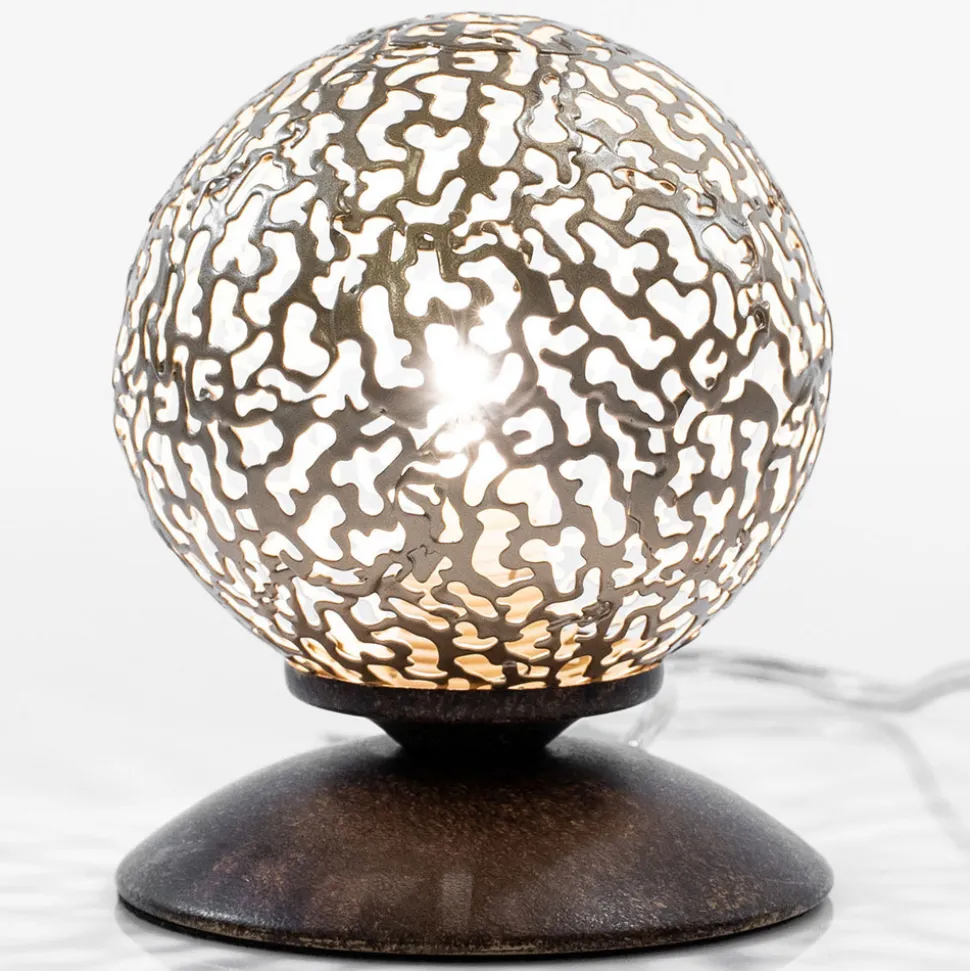 Lyseffekten er enestående som den lille bordlampen Greta skaper på flaten under seg og rundt seg. Den kuleformede skjermen som står på en rustfarget lakkert stålfot, består av metall som har retikulære perforeringer og er lakkert i gull. Halogenpærens lys skinner ut gjennom perforeringene, slik at det oppstår et virkningsfult lys- og skyggebilde. Bordlampen Greta betjenes med en snorbryter.