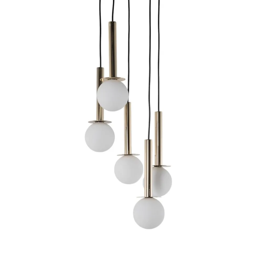 Hengelampen Daisy, 5 lyskilder, kombinerer moderne design med materialer av høy kvalitet. Den er laget av pulverlakkert stål og glass og imponerer med sin elegante farge i gull, hvitt og svart. Denne lampen er et blikkfang i enhver spisestue, stue eller gang og gir hvert rom en spesiell atmosfære. Muligheten for dimbarhet via en ekstern dimmer gir ekstra fleksibilitet i lysdesignet.