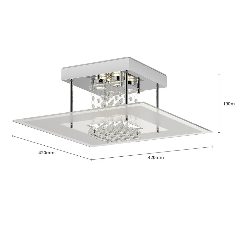 Taklampen Lisandra med LED-lys har et takfeste av forkrommet metall. Lampens skjerm består av delvis satinert glass med klar kant både inne og ute. Avstandsstykket av metall skaper avstand mellom festet og glassplaten. Her er pynten av krystallglass godt synlig, denne går også til midt på skjermen. De dråpeformede krystallelementene bryter lyset og skaper fantastisk glitrende aksenter.