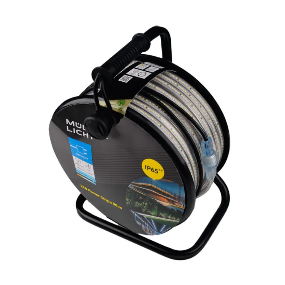 LED-stripe for utendørs bruk med IP65 og støpsel Denne LED-stripen, som leveres på en kabeltrommel med tilførselskabel og støpsel, er den ultimate belysningsløsningen for profesjonell utendørs bruk. Den ekstra lyse og kraftige LED-stripen fra Müller-Licht tilbyr den perfekte kombinasjonen av robusthet, fleksibilitet og brukervennlighet. Enten det er på byggeplasser, i lagerhaller, festkjellere eller for rask belysning av idrettsanlegg, arrangementer og uteområder – denne LED-stripen er alltid det riktige valget. Med imponerende lysstyrke og dagslys-hvitt lys gir LED-stripen jevn belysning. Takket være den praktiske kabeltrommelen og den enkle plug-and-play-løsningen er den klar til øyeblikkelig bruk – rull ut, lys opp, rull sammen, ferdig! LED-stripen er ikke bare ekstremt robust og fleksibel, men også spesialdesignet for innendørs og utendørs bruk. Med beskyttelsesklasse IP65 og slagfasthet på IK08 tåler den uten problemer de mest krevende forhold.