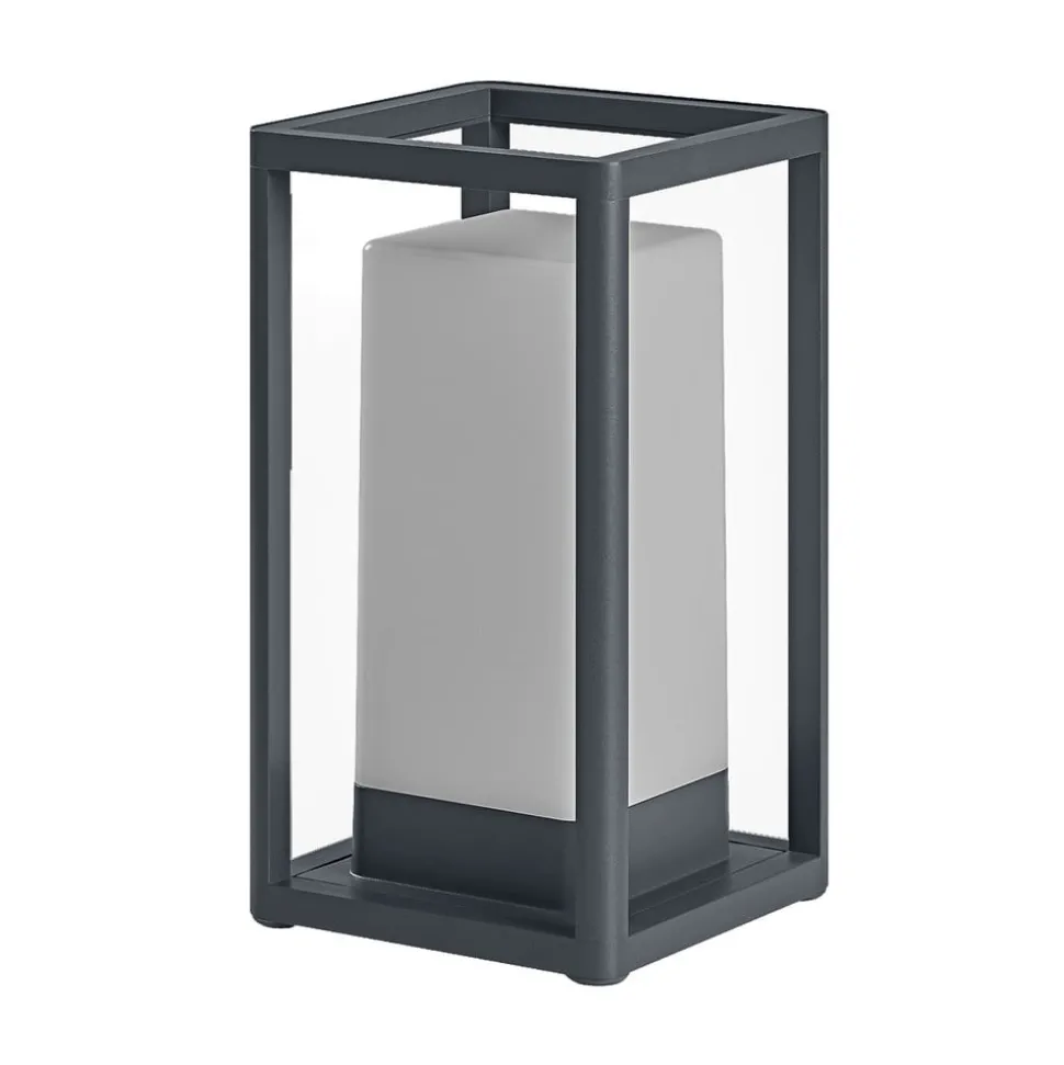 Dekorativ LED-bordlampe Table Frame Maxi Multifarget med oppladbart batteri, kan styres via app LED-bordlampen Frame Maxi kan også brukes utendørs uten strømtilkobling, da den er utstyrt med et oppladbart batteri som kan lades ved hjelp av den medfølgende USB-kabelen. Bordlampen i kantet, moderne lanterneform gir både farget lys fra ca. 16 millioner farger og varmhvit belysning (3 000 K), og kan kobles til via WLAN for styring via app på nettbrettet/smarttelefonen eller med talekommando.