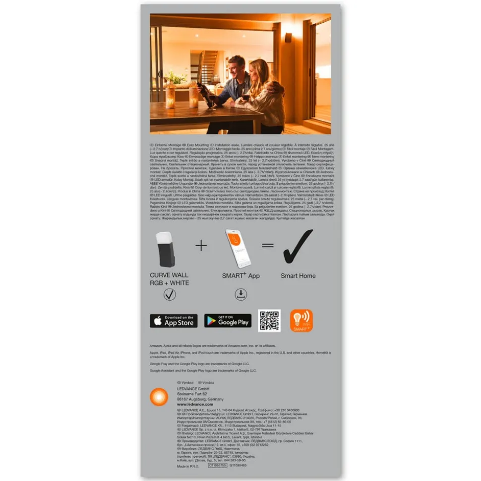 Diskret buet Curve LED utendørs vegglampe med LEDVANCE SMART+ WiFi-teknologi Curve LED utendørs vegglampe med varmhvitt eller farget lys og justerbar lysstyrke er perfekt for både allmenn- og stemningsbelysning i moderne uteområder. Den flate, kubiske vegglampen, som er svakt buet forover på toppen, har en veggbrakett og et armaturhus i aluminium, med en opal skjerm i polykarbonat over. Den integrerte LEDVANCE SMART+ WiFi-teknologien brukes til å koble til smarttelefonen/nettbrettet via WLAN, slik at Curve kan styres smart via app eller talekommando. Tekniske data / kompatibilitet: – kan styres med LEDVANCE SMART+ WiFi-appen (gratis tilgjengelig for iOS og Android); muliggjør forhåndsinnstillinger og automatisering – kan styres via Google Assistant eller Amazon Alexa – dimbar – lysfarger: Varmhvit (3000 K), ca. 16 millioner fargenyanser – Trådløs protokoll: WiFi 2.412 – 2.484 GHz De nye LEDVANCE-produktene, tidligere kjent under merkenavnet OSRAM, kombinerer de høyeste kvalitetsstandardene med moderne design.