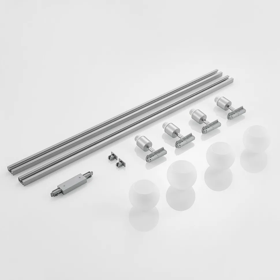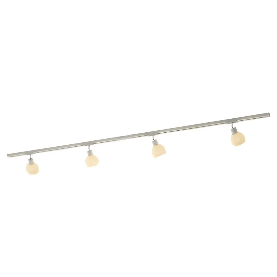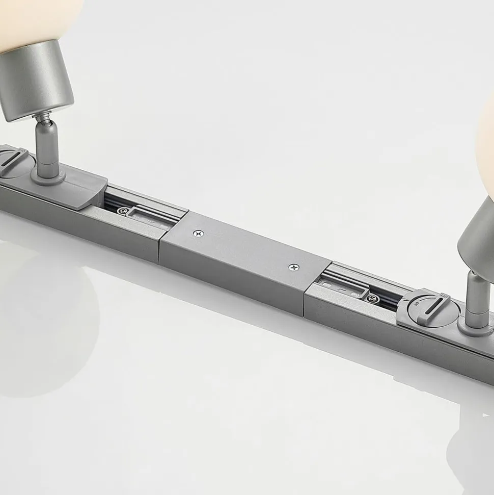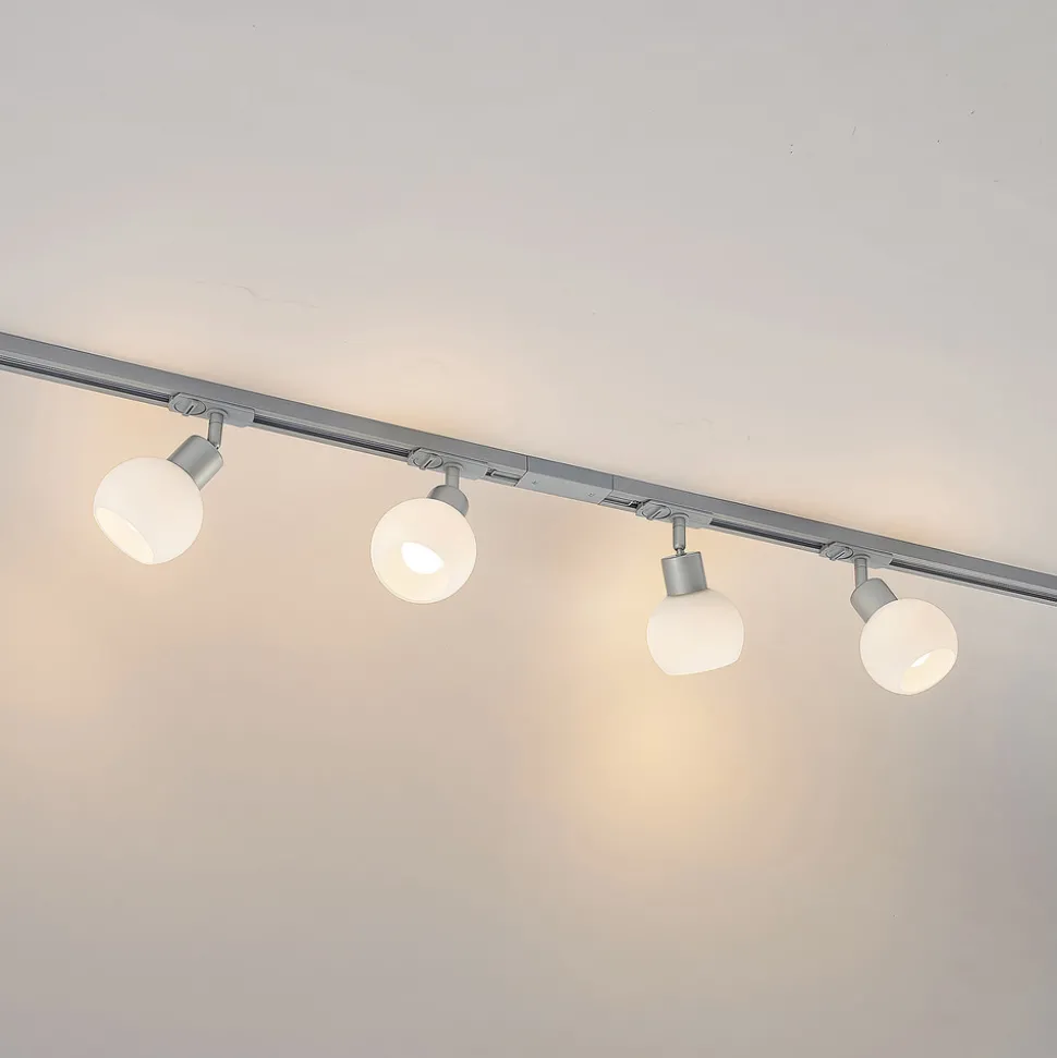Silver Linaro 1-fase skinne med fire spotlights Linaro består av en strømskinne og fire bevegelige spotlights som gir mulighet for individuell lysretning. Hver skjerm er kuleformet og laget av hvitt glass for å skape et behagelig lys i stuen. 2 x 1 m lang skinne, en mellomtilkobling, to endestykker og fire spotter følger med denne 1-fase skinnen.