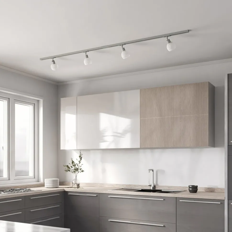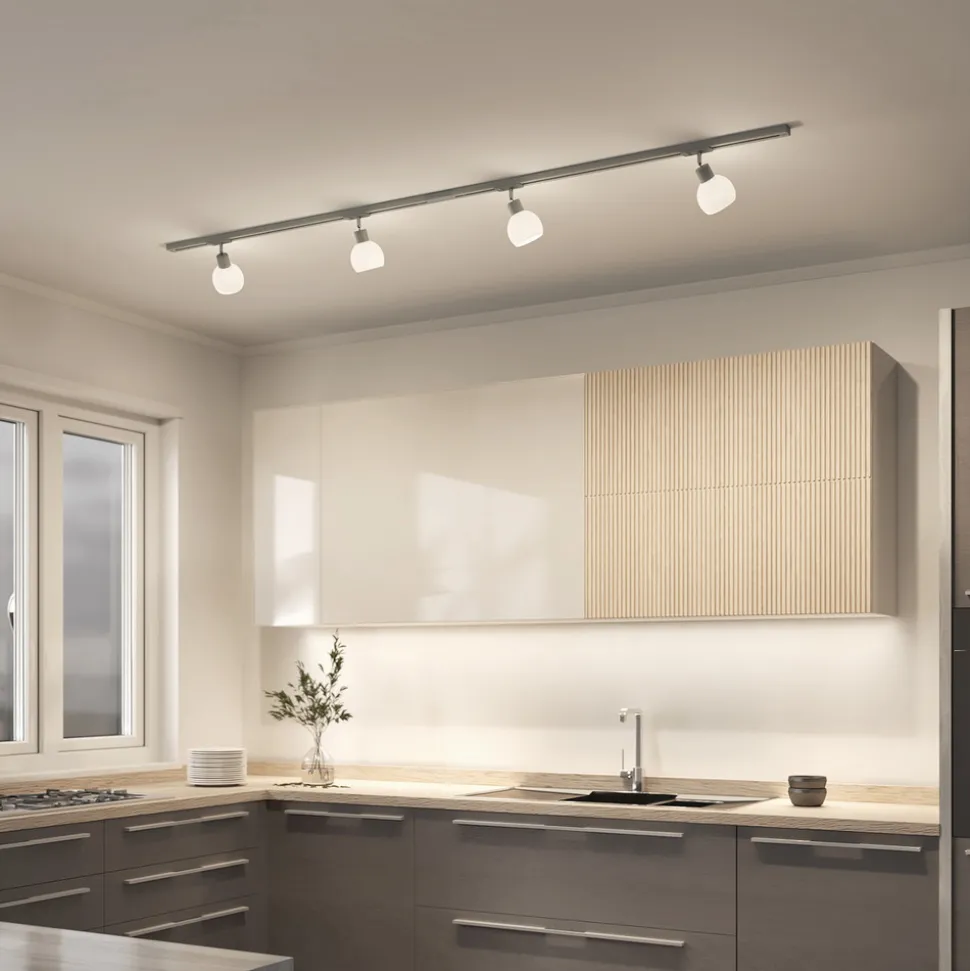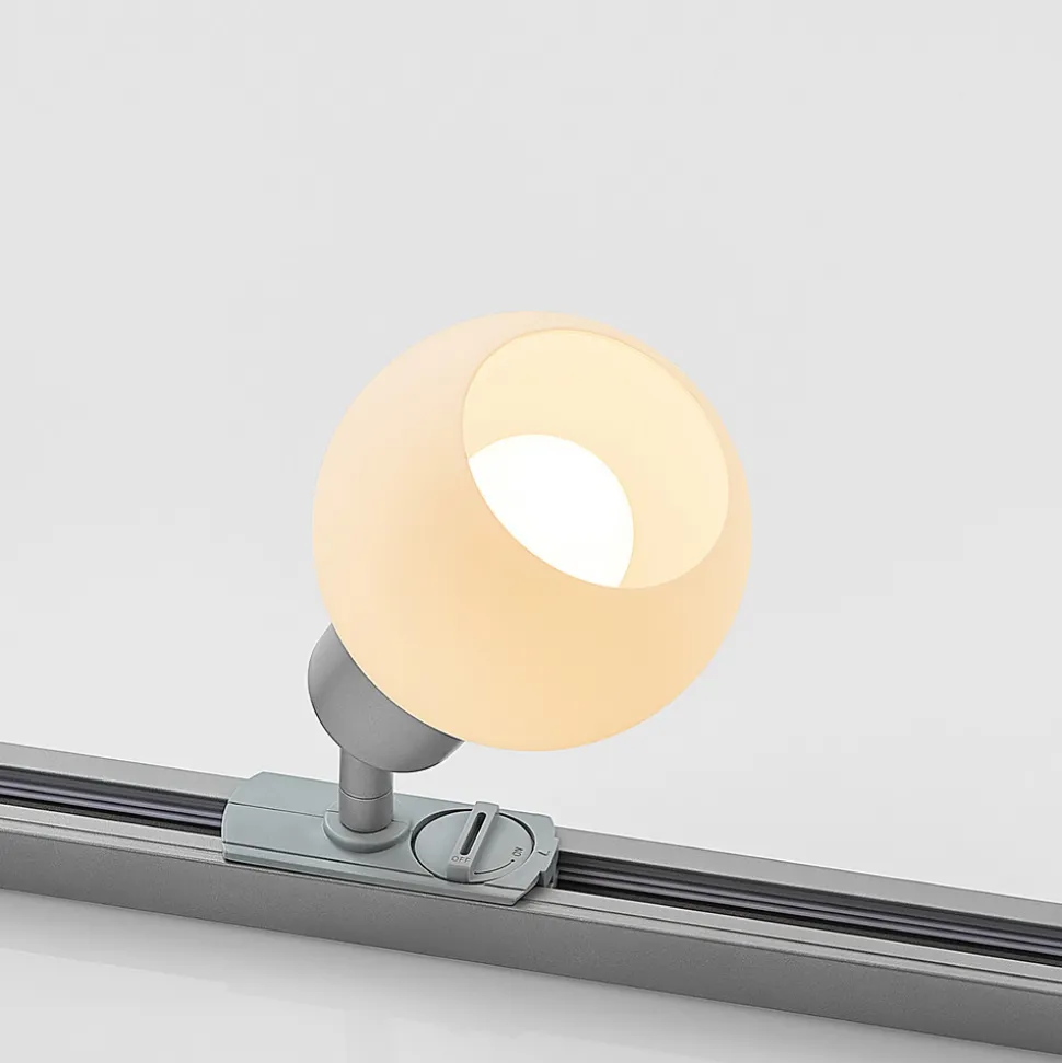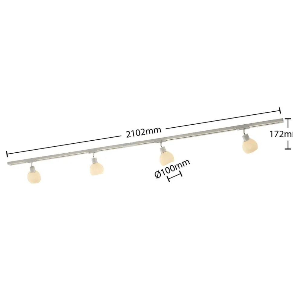 Silver Linaro 1-fase skinne med fire spotlights Linaro består av en strømskinne og fire bevegelige spotlights som gir mulighet for individuell lysretning. Hver skjerm er kuleformet og laget av hvitt glass for å skape et behagelig lys i stuen. 2 x 1 m lang skinne, en mellomtilkobling, to endestykker og fire spotter følger med denne 1-fase skinnen.