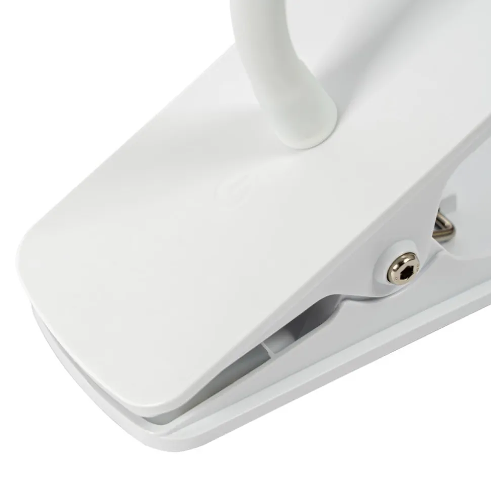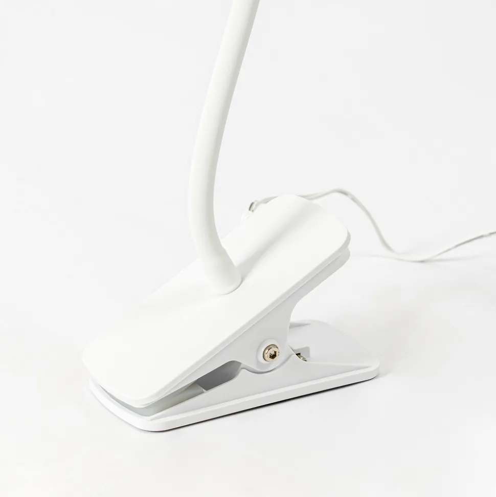 Hvit LED-klemmelampe Ailina med rund lampeskjerm og berøringsdimmer Denne lampen passer godt til skrivebordet eller en hylle og festes godt til det respektive objektet med en klemmebase. Lampehodet kan justeres etter behov, slik at du alltid kan skape det rette lysmønsteret med denne LED-klemmelampen. Den hvite overflaten sørger for et tidløst utseende, og LED-klemmelampen fremstår også som en elegant helhet som passer godt til moderne innredning, både praktisk og visuelt. Takket være en berøringsdempingsfunksjon kan lysstyrken på Ailina justeres i tre trinn hvis det er ønskelig.