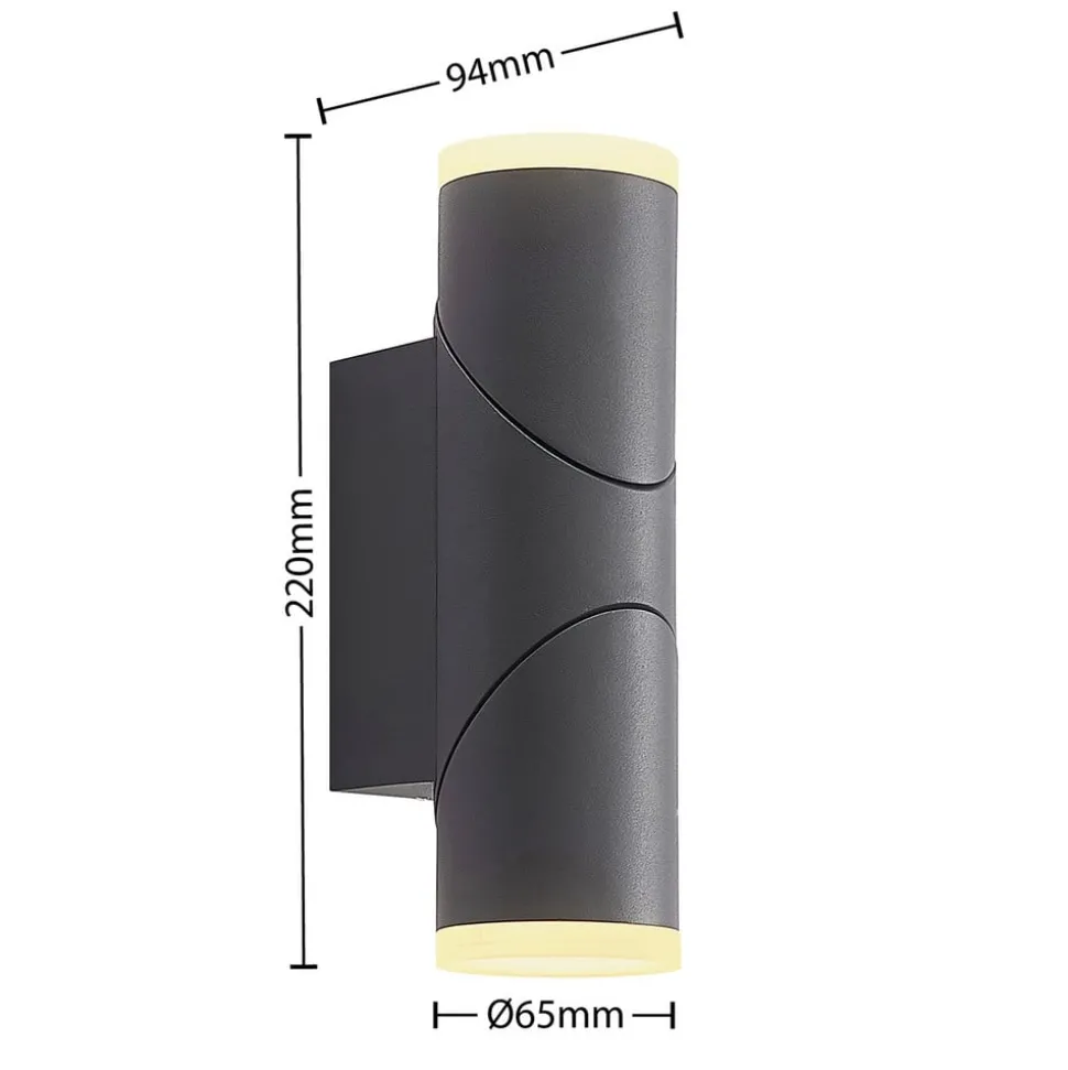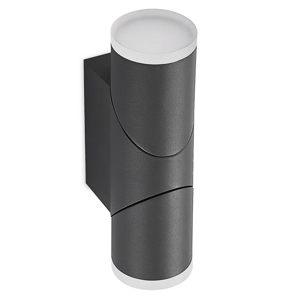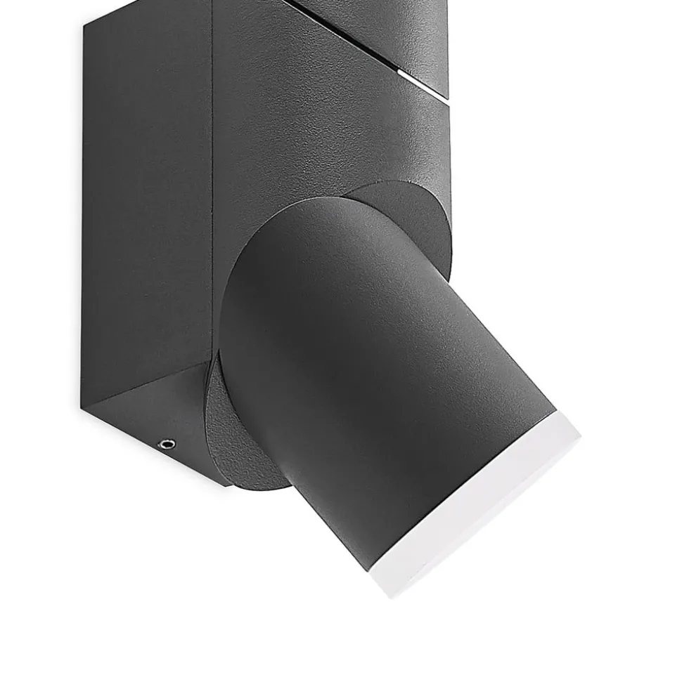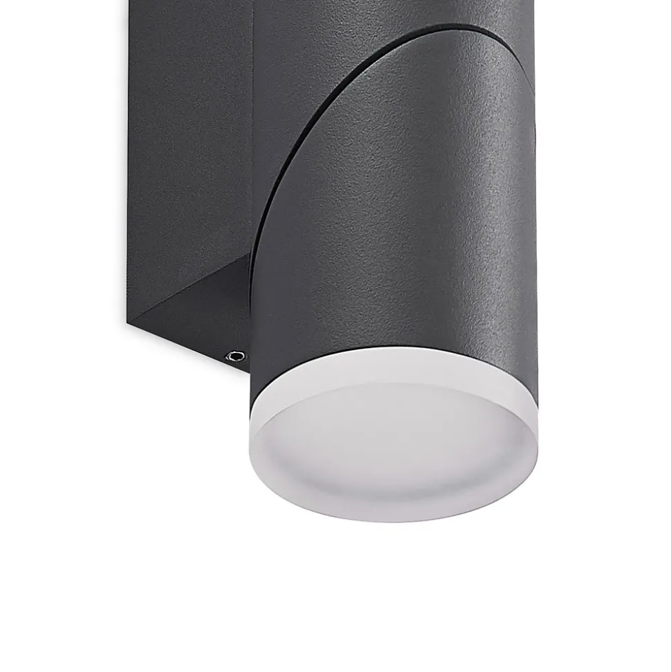 Aspyn utendørs LED-vegglampe med 2 lyskilder i mørkegrå aluminium Aspyn er ideell for belysning av oppkjørselen eller uteplassen. Lampekroppen er laget av mørkegrå aluminium og har to hvite plastdiffusorer, og bak disse er det fastmonterte LED-lamper. Disse lysdiodene genererer varmhvit belysning som skaper en hyggelig atmosfære i uteområdet. Med kapslingsgrad IP54 er den utendørs LED-vegglampen Aspyn beskyttet mot støv og vannsprut, noe som gir den en robust karakter. De to hodene er bevegelige og gjør det mulig å justere lysstrålen på en fleksibel måte.