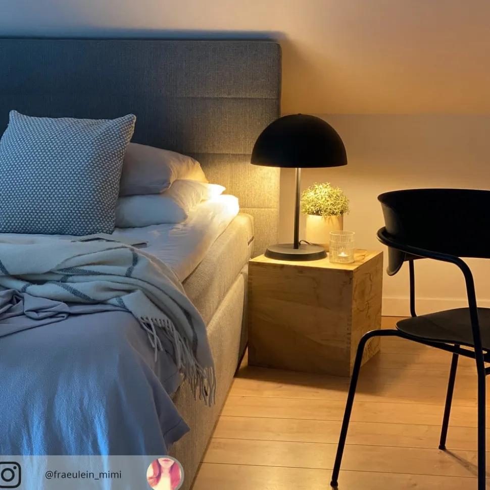Idalene bordlampe i svart og gull med kuppelformet metallskjerm Idalene er en bordlampe som umiddelbart imponerer med sin tidløse design og sitt spesielt stilrene uttrykk. Lampens metallskjerm er formet som en kuppel eller halvkule, noe som gjør at lyset kun skinner nedover og oppleves som spesielt mykt og flytende. Det er nesten ikke noe blending. Den gylne innsiden av lampeskjermen i metall avgir også et varmt og herlig koselig lys, noe som skaper et vakkert feelgood-lys som er like velkomment i stuen som på soverommet.