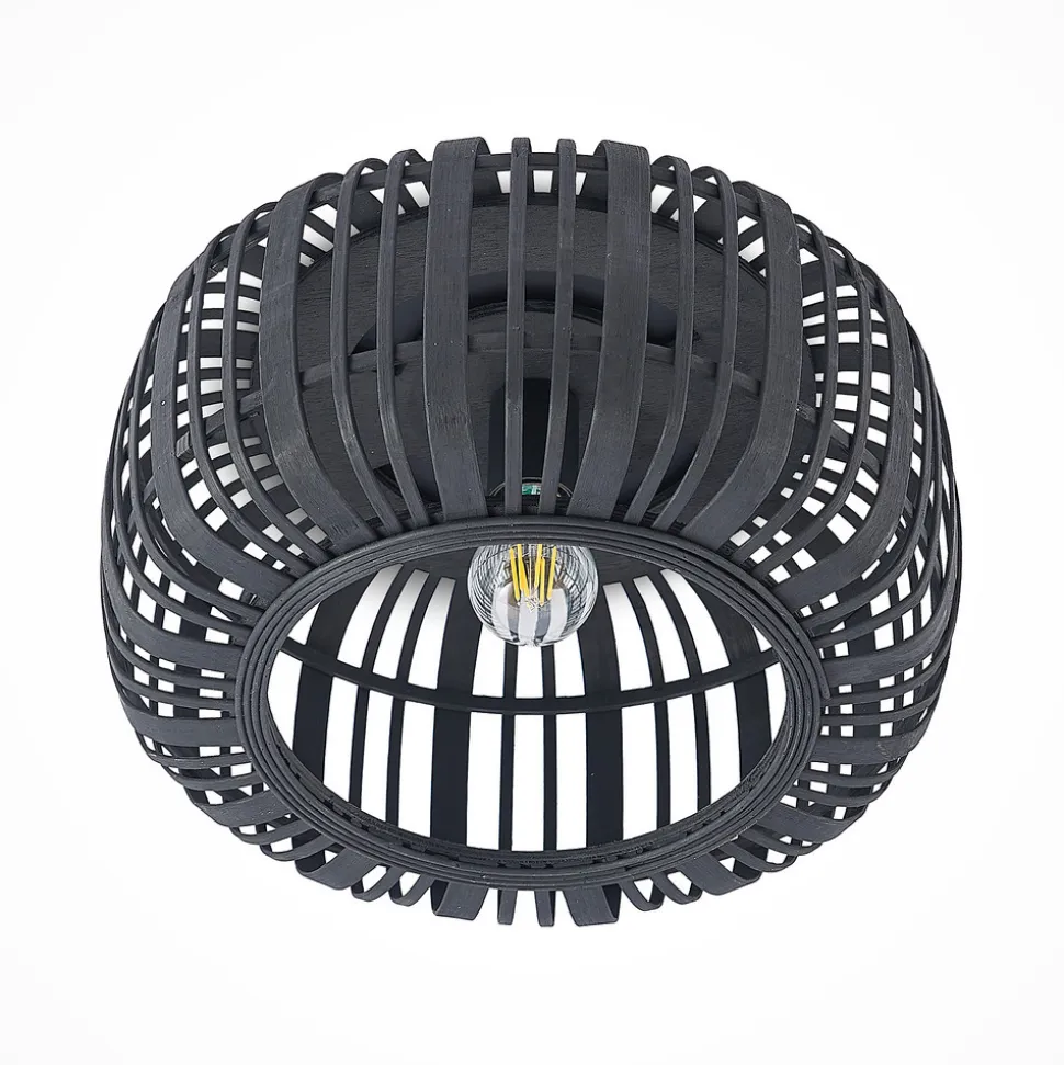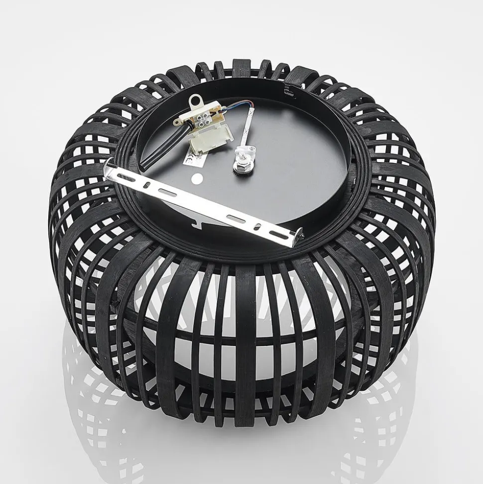 Canyana taklampe med svart skjerm i rotting Den pæreformede skjermen på Canyana taklampe består av individuelle rottingstenger. Den svarte fargen på rottingen gir armaturen et moderne utseende, og stiverne skaper vakre skygger i omgivelsene på grunn av lyset fra pæren. Takplaten på armaturen er laget av metall og er utstyrt med en E27-fatning i midten. Et vakkert utseende oppnås når en LED-globepære med spesialformede LED-er brukes som lyskilde.