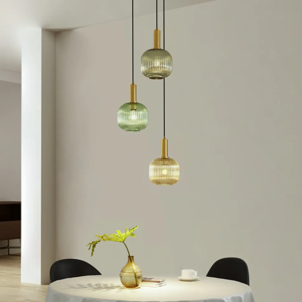 Vintagesjarm møter fargeaksenter: Hengelampe i grønn/amber/røykgrå Doroteo hengelampe har 3 lyskilder og kombinerer vintageestetikk med en trio av tiltalende fargetoner – grønn, amber og røykgrå. Lampen er et stilfullt tilskudd til spisestuen eller stuen som ikke bare imponerer med sin design, men også med sin funksjonalitet. Selv om det ikke følger med en dimmer, kan lysintensiteten justeres via en ekstern dimmer (må kjøpes separat) for å skape ønsket atmosfære. Med sine 3 lyskilder gir lampen jevn belysning og setter samtidig dekorative aksenter.