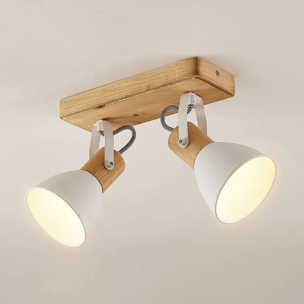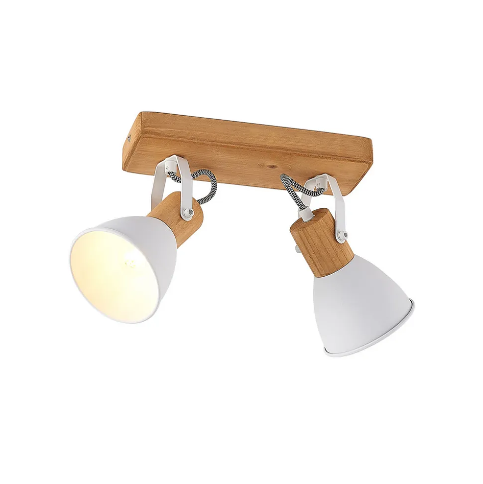 Merela taklampe med 2 spotlights i skandinavisk design Merela taklampe med 2 lyskilder skaper skandinavisk stil i ethvert rom. Baldakinen og skjermenes bakre ender, der fatningene er plassert, er laget av furu, mens skjermene og konsollene er laget av matt hvitlakkert metall i vakker kontrast. De to spotlightformede lampene og konsollene kan roteres på baldakinen og svinges i konsollene etter behov, slik at lyset kan spotlightes inn i bestemte områder av rommet. Merela downlight med 2 lyskilder egner seg derfor spesielt godt i korridorer eller oppholdsrom der det er behov for målrettet lys.