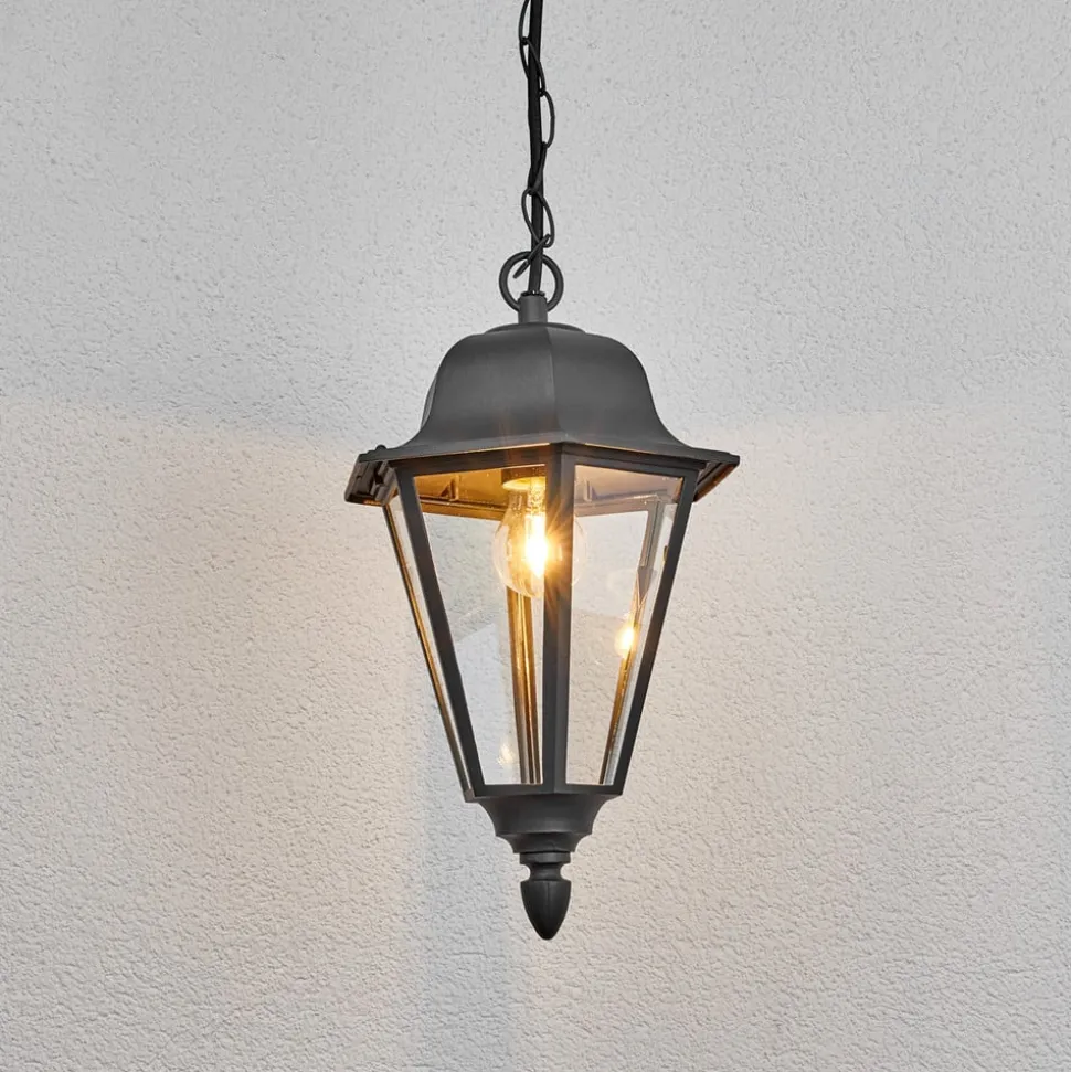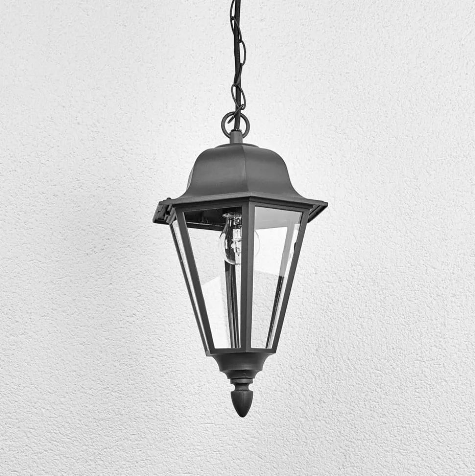Antracittfarget Edana hengelampe for utendørs bruk Når du ser på Edana, blir du umiddelbart minnet om lyktene som var den viktigste formen for belysning i tidligere århundrer. Dette gir hengelampen et nostalgisk preg, og derfor ser Edana også ut til å passe godt inn i historiske bygninger. Overflaten har en tidløs antrasittfarge, og Edana er designet som en utendørs pendellampe som kan utstyres med E27-pærer. Det betyr at ikke bare de velkjente glødepærene eller halogenpærene kan brukes her, men de som ønsker det, kan også bruke LED-pærer, som bruker svært lite energi og noen ganger er designet slik at de til forveksling ligner på en glødepære.