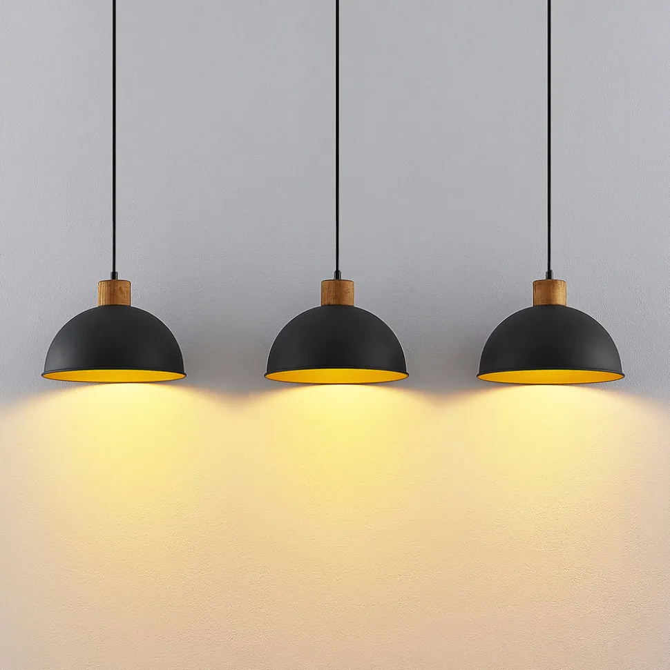 Flurin 3 lyskilder i robust design av jern og gummitre Flurin pendellampe kombinerer en robust karakter med en koselig fargekombinasjon. Lampeskjermene er laget av jern og har en sandsvart utside, mens de indre veggene har en slående gullfarge. I hver skjerm er det plass til en E27-pære, som sørger for den nødvendige belysningen. Lyset dimmes på en behagelig måte gjennom åpningen på undersiden, noe som gjør den perfekt til å lyse opp et langt spisebord. Den passer godt inn i mange forskjellige møbleringsstiler og gjør ethvert rom til noe helt spesielt.