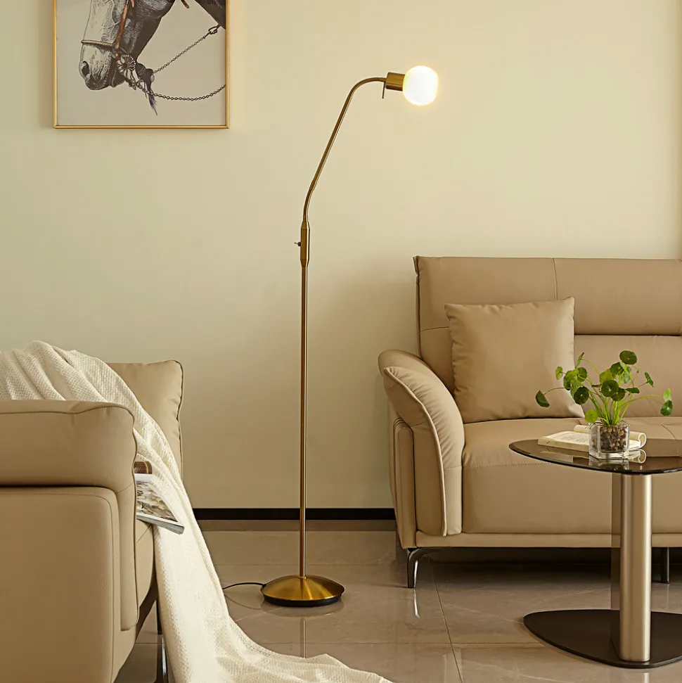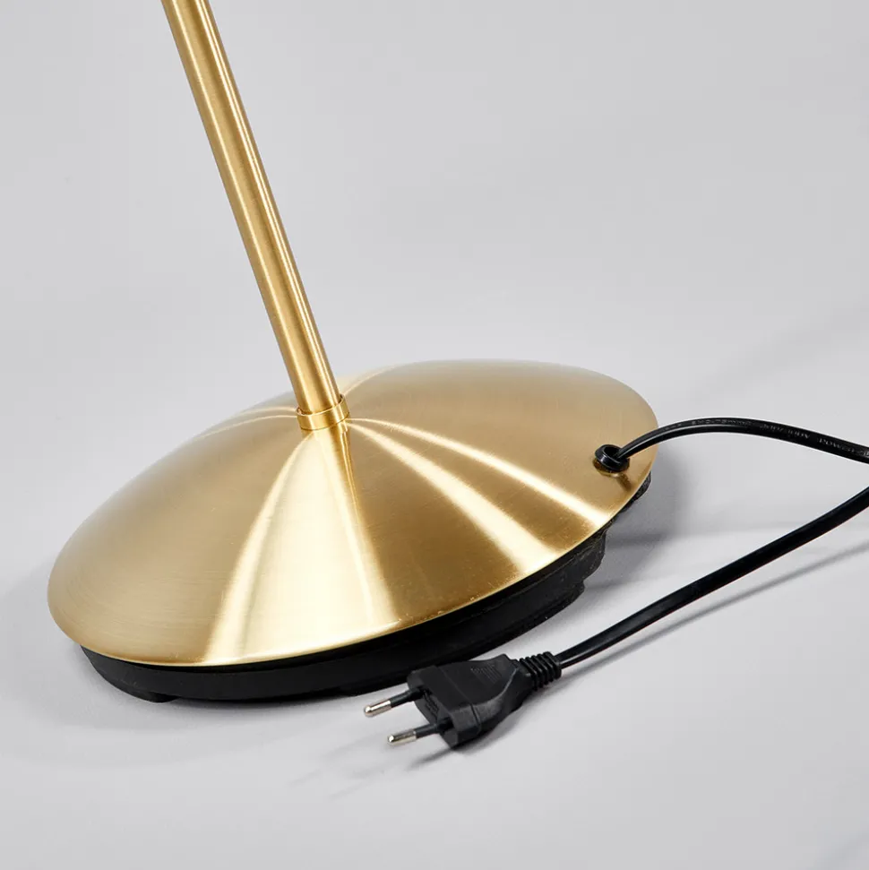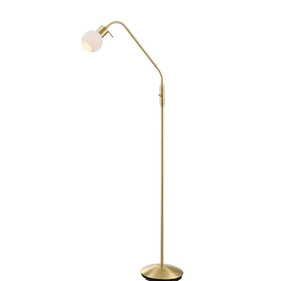 Diskret Elaina gulvlampe med messingfarget overflate Denne gulvlampen er et vakkert tilskudd til stuen, der den kan brukes som utmerket leselys. Den kan plasseres ved siden av sofaen og slås på når det er behov for ekstra sterkt lys, slik at du kan slappe av og bla i favorittboken din. Lampehodet i hvitt glass har en kompakt design og er formet som en kule med en liten åpning foran. To fleksible ledd – det ene under lampehodet og det andre over midten av rammen – gjør det mulig å justere lyset optimalt. Bryteren er også plassert i midten av rammen, litt under det andre fleksible leddet, og kan betjenes raskt, selv når du allerede har satt deg godt til rette i sofaen.