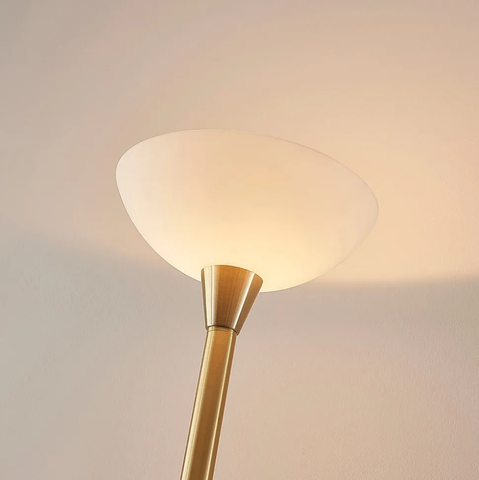 Ignacia rund uplight med klassisk messingfinish Ignacia har en glassskjerm som er åpen på toppen og spotlighter indirekte. Dette gir en veldig koselig belysning i stuen. Denne typen belysning er spesielt velkommen på koselige kvelder, når hovedbelysningen ofte oppleves som for sterk og ubehagelig. I utgangspunktet fremstår uplighten svært enkel med sin minimalistiske form, men den messingfargede overflaten gir gulvlampen en mer klassisk effekt.