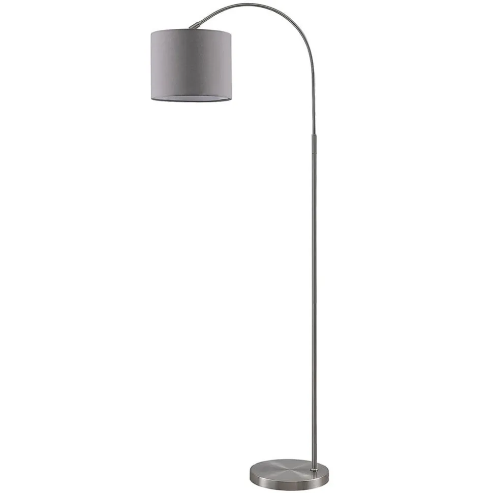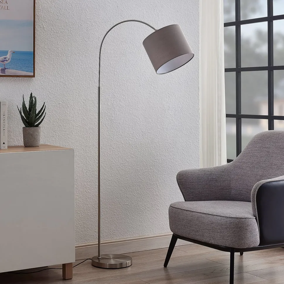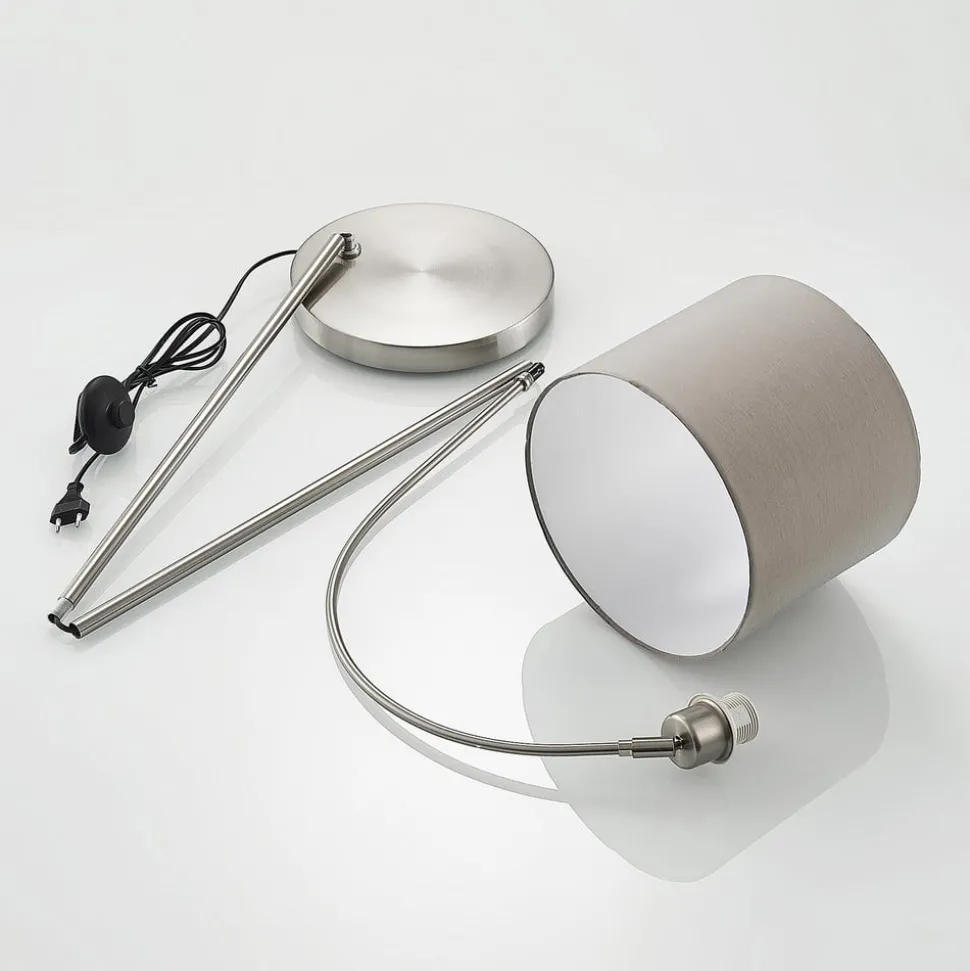 Elegant Keriba buet gulvlampe med sylindrisk stoffskjerm i taupe og fotbryter Keriba er ideell som ekstra belysning i stuen eller på soverommet, og er en gulvlampe med en diskret buet form som gjør den ideell å plassere innen rekkevidde av en sofa eller lenestol, og som er en god leselampe. Lampeskjermen ligner en sylinder og er laget av et behagelig stoff i taupe, en stilig blanding av grått og brunt. Lampen betjenes raskt og enkelt med en fotbryter, og lyset kjennetegnes av høy komfortfaktor. Siden skjermen kan svinges litt, er det lettere å justere lysretningen.