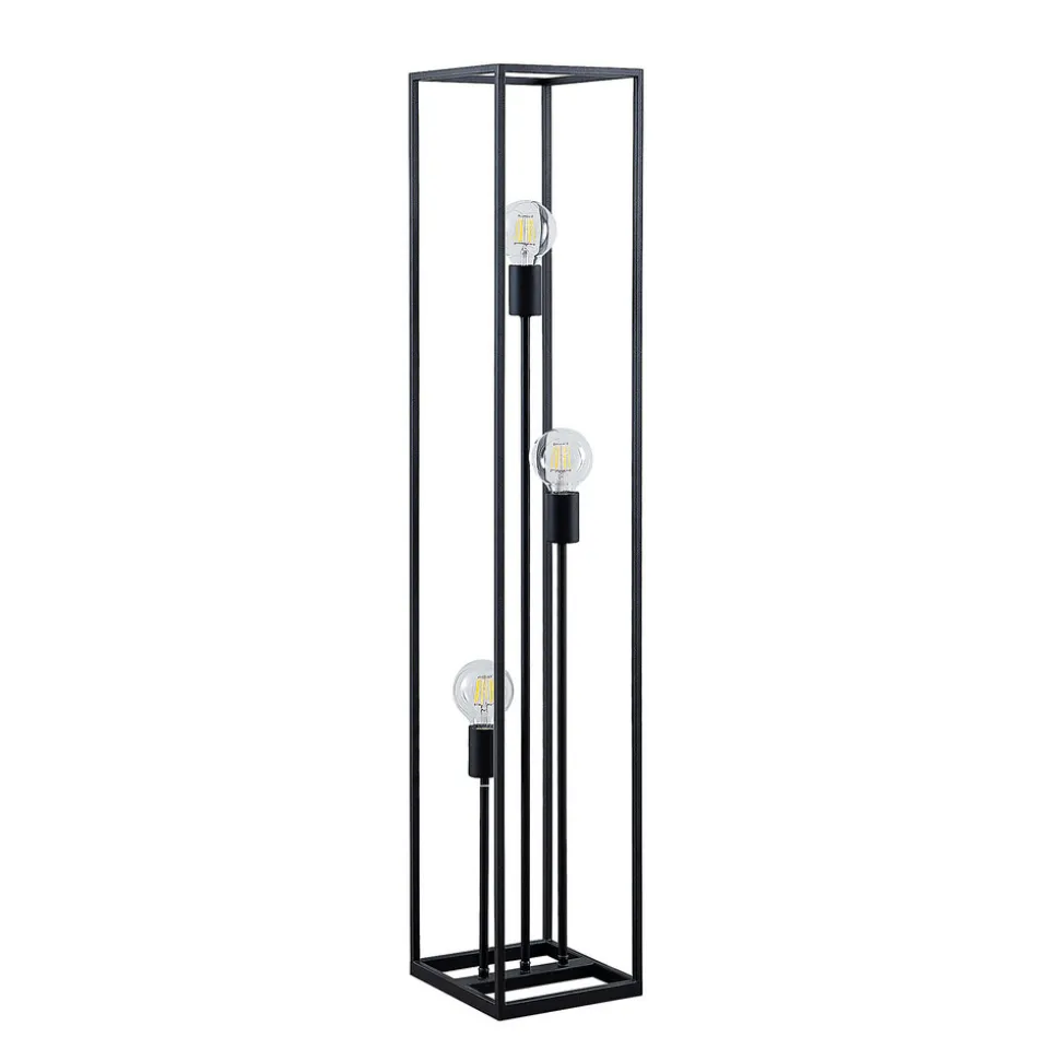 Rammeformet gulvlampe Krisha i svart stål, 3 lyskilder Denne gulvlampen er virkelig noe spesielt, for den svarer ikke til den klassiske stereotypen av en gulvlampe, der man umiddelbart tenker på en ramme og skjerm. Her er skjermen helt sløyfet, og rammen ligner en rektangulær ramme som er helt åpen på sidene. Overflaten på stålrammen er lakkert matt svart, noe som gir den et moderne og elegant uttrykk. Innvendig er tre E27-fatninger hengt opp i stenger og plassert i ulike høyder. Når du ser på gulvlampen Krisha, kan du få inntrykk av at en stor lykt med tre stearinlys pynter opp i rommet. For å perfeksjonere stemningen av levende lys bør man bruke glødepærer eller rustikkpærer med spesielt varme toner, som om ikke minner om stearinlys, så i hvert fall om den gode, gamle tradisjonelle glødepæren, og som finnes i ekstra varme lysfarger. Dette skaper en koselig atmosfære i rommet, også for dem som ikke vet hva de skal gjøre med åpen ild og levende lys, eller synes det er for farlig. Stilfull belysning for elegante interiører!