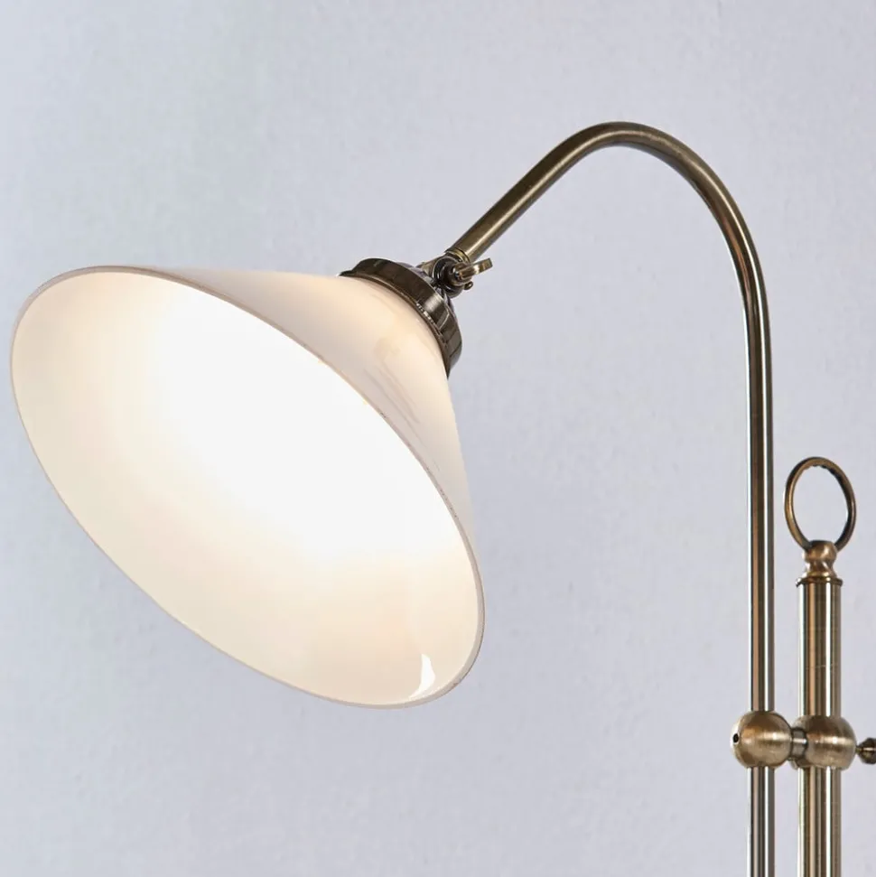 Gammel messingfarget Otis gulvlampe med nedovervendt skjerm Gulvlamper oppleves alltid som et vakkert tilskudd til hovedbelysningen, spesielt i oppholdsrommet. Det skyldes først og fremst at de som regel skaper et koselig lys som innbyr til avslapping. Dette gjelder også Otis, som også kan brukes som leselys, men som også kan slås på i stedet for hovedbelysningen. Den buede lampearmen er koblet til resten av stativet på en slik måte at høyden på gulvlampen kan justeres litt ved å skyve stangen opp eller ned. Høyden kan dermed justeres fra 145 cm til 170 cm.