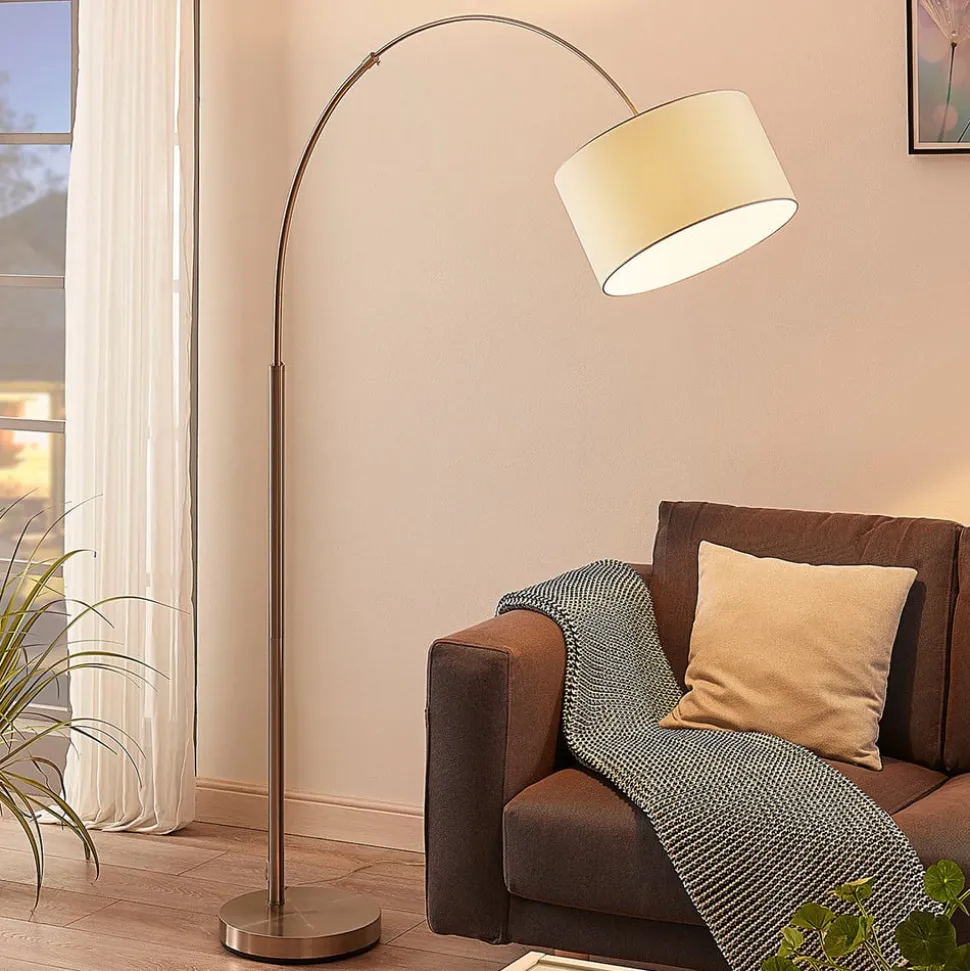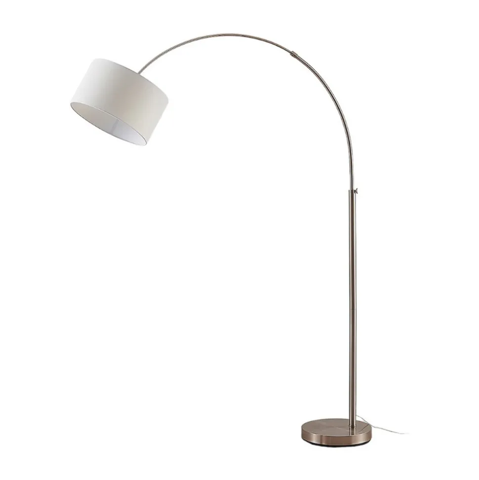 Elegant Railyn buet gulvlampe med sylindrisk tekstilskjerm Railyn er en buet gulvlampe som passer svært godt i stuen, der den gir en vakker aksentbelysning om kvelden. Den buede formen gjør Railyn ideell for bruk i umiddelbar nærhet av sofaer, for selv om det ikke er plass til sokkelen på grunn av sofaen, når lyset likevel frem til riktig sted takket være denne utformingen. Tekstilskjermen er sylindrisk og antikkhvit, og lyset virker varmt og koselig, akkurat slik man ønsker seg i et oppholdsrom. Med sitt helhetlige utseende ser buelampen alltid stilig ut og utstråler tidløs skjønnhet. Du kan bruke pærer etter eget valg, og spesielt anbefales energibesparende LED-pærer.