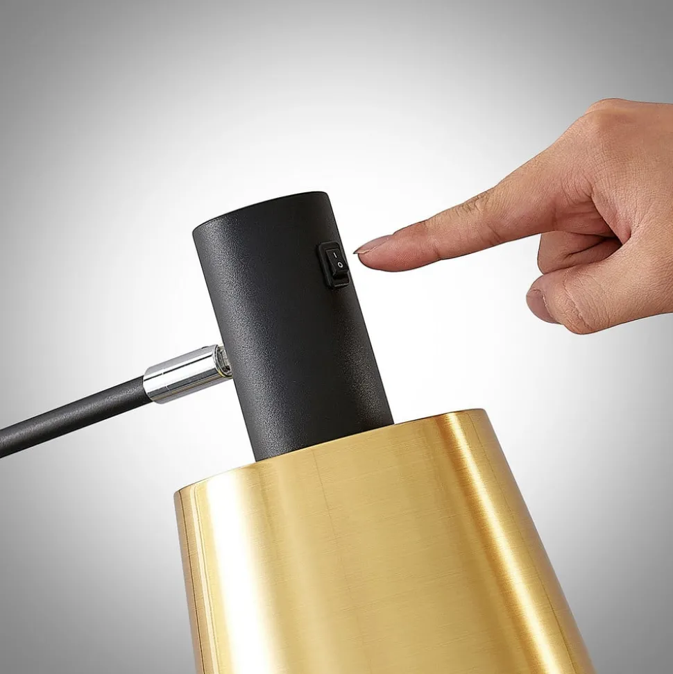 Elegant Vlada gulvlampe med filigranutseende og messingfarget skjerm Vlada passer godt til en skandinavisk boligstil, da gulvlampen har et tilsvarende puristisk og designorientert utseende. Den svarte metallrammen er slank og skrå øverst, mens lampen avsluttes med en rund base nederst. Den kompakte lampeskjermen i metall, som skiller seg ut med sitt elegante messingskimmer og fullfører designet, gir en vakker, harmonisk kontrast. E27-lampen som skal brukes, har ideelt sett en glødetråd for å fullføre looken med stil. Med alle sine funksjoner er Vlada en gulvlampe som egner seg godt som sidebelysning i stuen og er ideell til lesing.