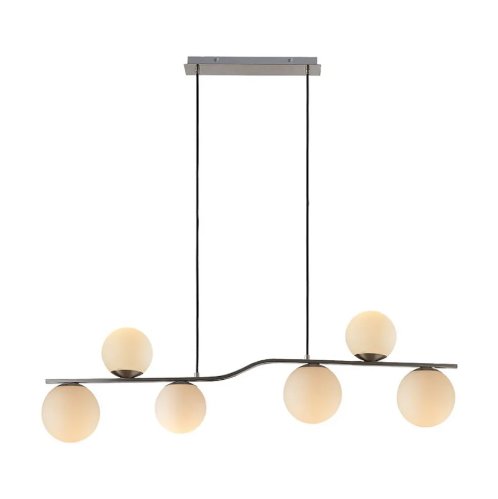 Avalyn hengelampe med 6 lyskilder og hvite glasskuler i to forskjellige størrelser Avalyn er en svært tiltalende lyskilde til spisestuen som gir god stemningsbelysning til spisebordet takket være de seks glasskulene. Den opalhvite overflaten er også den beste garantien for et mykt og behagelig lys, siden den ikke blender. Rammen er lett bølget, og de seks kuleformede glasskulene er festet til rammen i to forskjellige størrelser. Ideell for moderne interiør!