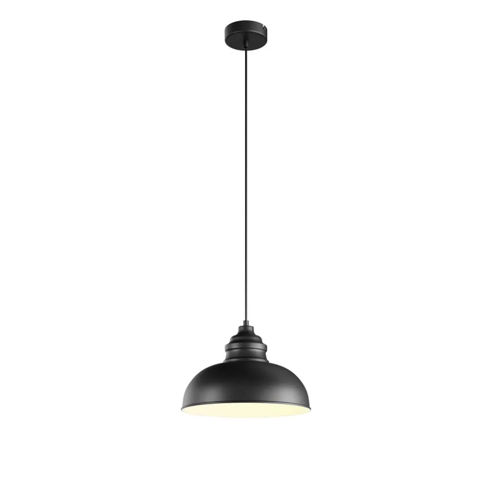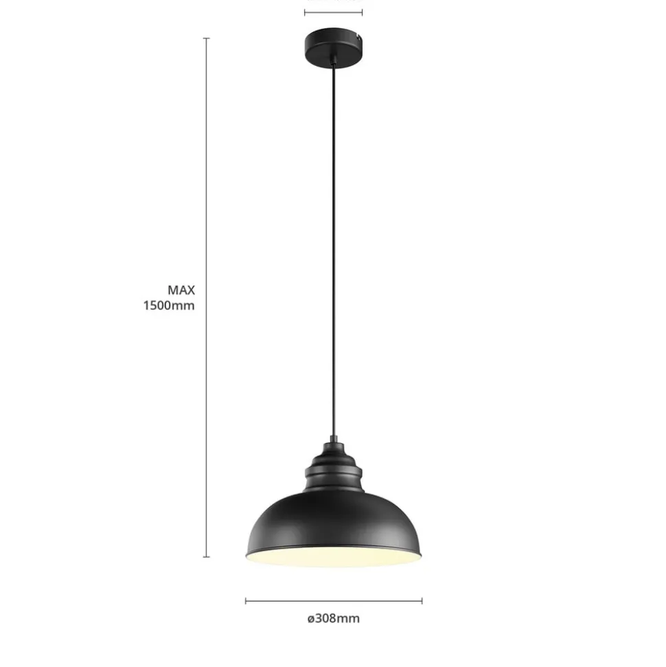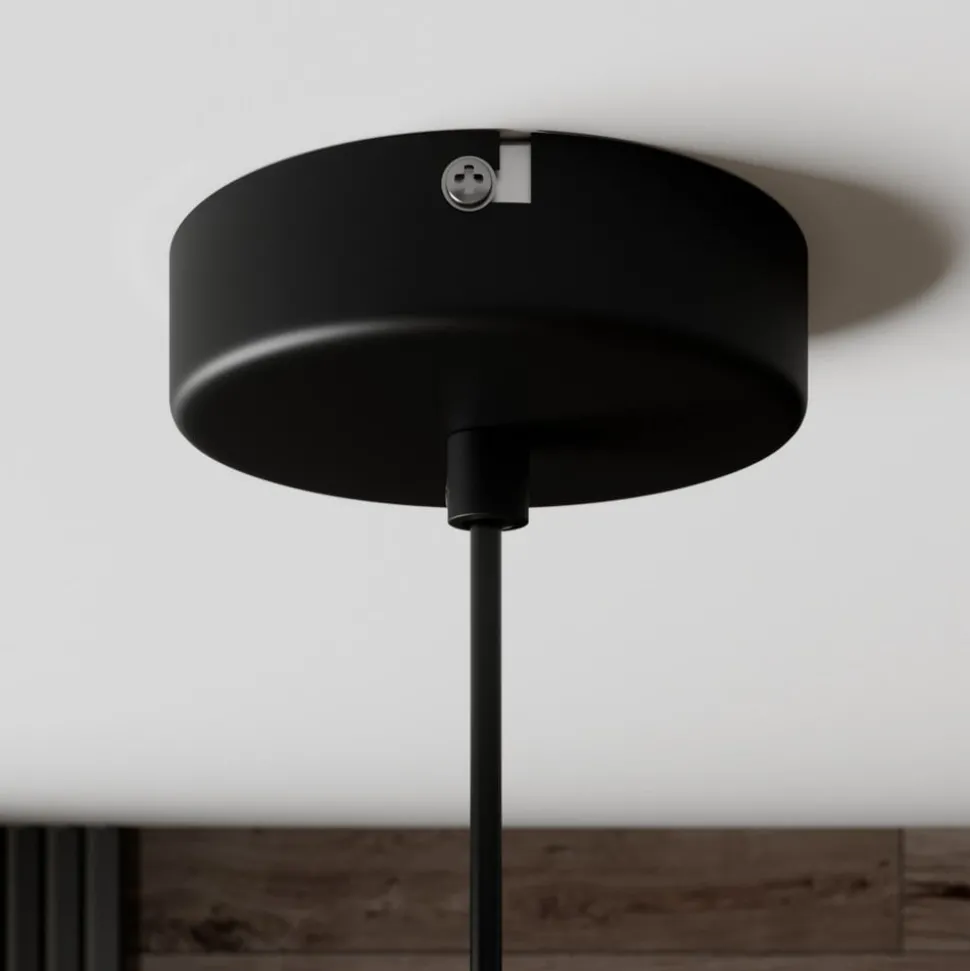 Matt svart Cliona hengelampe Cliona hengelampe har en matt svart farge over det hele. Det er bare innsiden av skjermen som skiller seg fra dette, da skjermen er hvit på innsiden. Dette sikrer at lyset kan sendes ut så godt som mulig. Lampen passer fint over et spisebord, men kan også brukes andre steder. På grunn av skjermens form og understellsmaterialet i metall sendes lyset imidlertid bare nedover, og overflaten under blir belyst spesielt godt og sterkt.