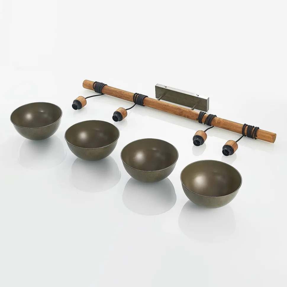 4 lyskilder Durbis med håndfargede metallskjermer Durbis er en 4 lyskilder pendel som består av en kombinasjon av håndfargede metallskjermer i mørkegrått og et langt treelement. De brede lampeskjermene er utstyrt med E27-fatninger som kan brukes med alle typer pærer. De sender kun lys nedover i en vid vinkel, slik at lyset kan brukes til å lyse opp et bord eller en disk på en perfekt måte. De enkelte lampeskjermene kan opphengssystemet er fleksibelt ved at kabelen løkkes rundt det lange treelementet mer eller mindre ofte.