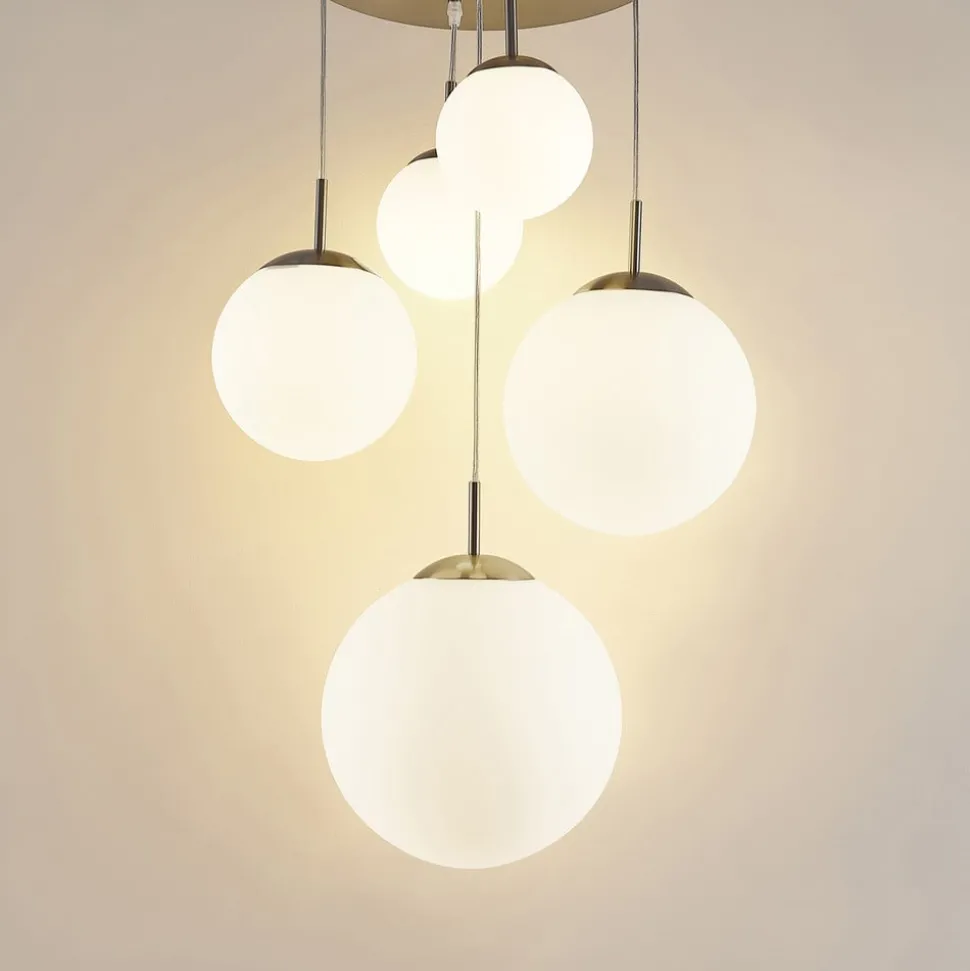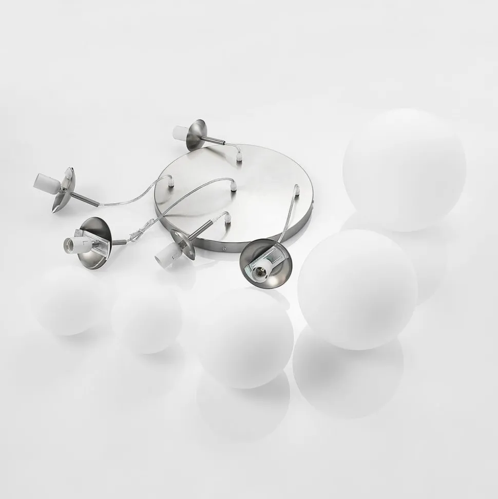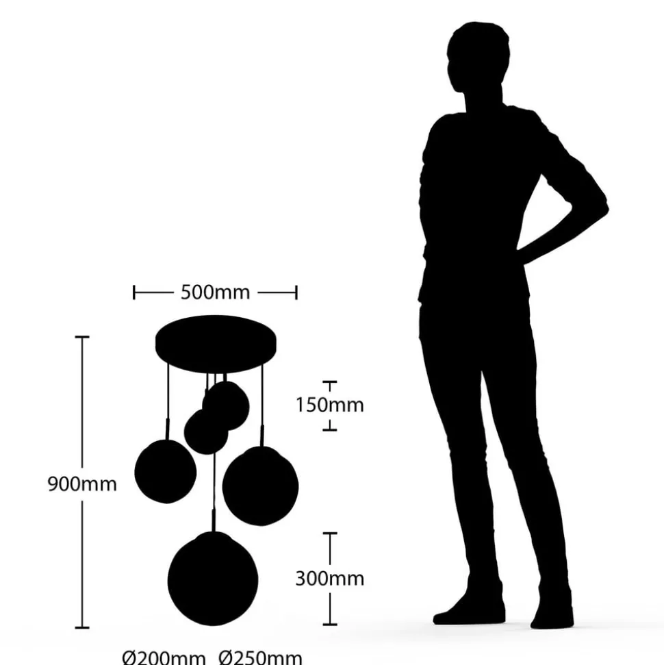 Heleska 5 lyskilder med sfæriske glasskjermer Heleska hengelampe kommer i en slående vakker design. Den imponerer med en baldakin i nøytral metall med nikkelfinish. Det filigrane opphengssystemet er knapt merkbart og virker nesten usynlig, mens de fem kuleformede lampeskjermene i opalhvitt glass står i sentrum. De svever ned fra taket nesten som skyer, og tilfører interiøret en viss letthet og eleganse. Vær oppmerksom på: De små kulene kan bare monteres med dråpepærer (maks. 4,5 cm brede og 7,8 cm lange).