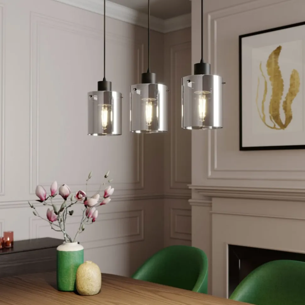 Lindby hengelampe Kourtney, 3 lyskilder, svart/grå, glass, E27