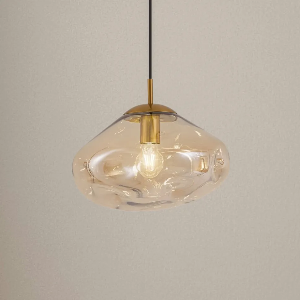 Lelia – 1 lyskilde i glass med ravfarget skjerm Oppdag hengelampen Lelia, et mesterverk av designeren Ingo Thiele, som imponerer med sine rav- og messingfarger. Denne lampen kombinerer design og moderne stil og passer sømløst inn i estetikken i spisestuen og stuen. Den er laget av glass og jern av høy kvalitet og lover holdbarhet og et tiltalende utseende. Lelia hengelampe er ikke bare et visuelt blikkfang, men også fleksibel i sin funksjonalitet. Selv om det ikke følger med en dimmer, kan lysstyrken justeres ved hjelp av en ekstern dimmer for å skape ønsket atmosfære. Fra et beroligende skimmer til oppkvikkende lysstyrke – med denne lampen kan du variere stemningen i rommet etter eget ønske.