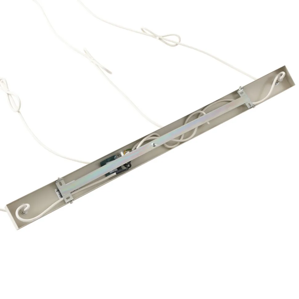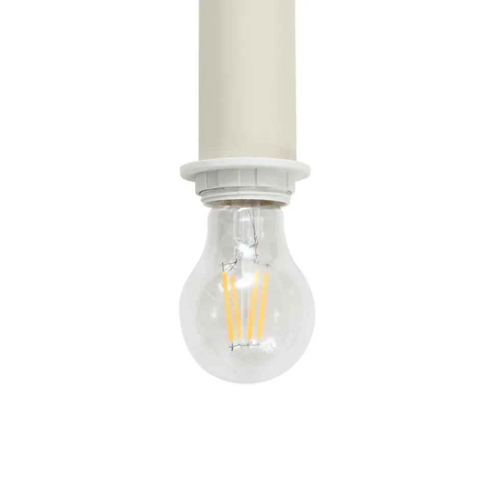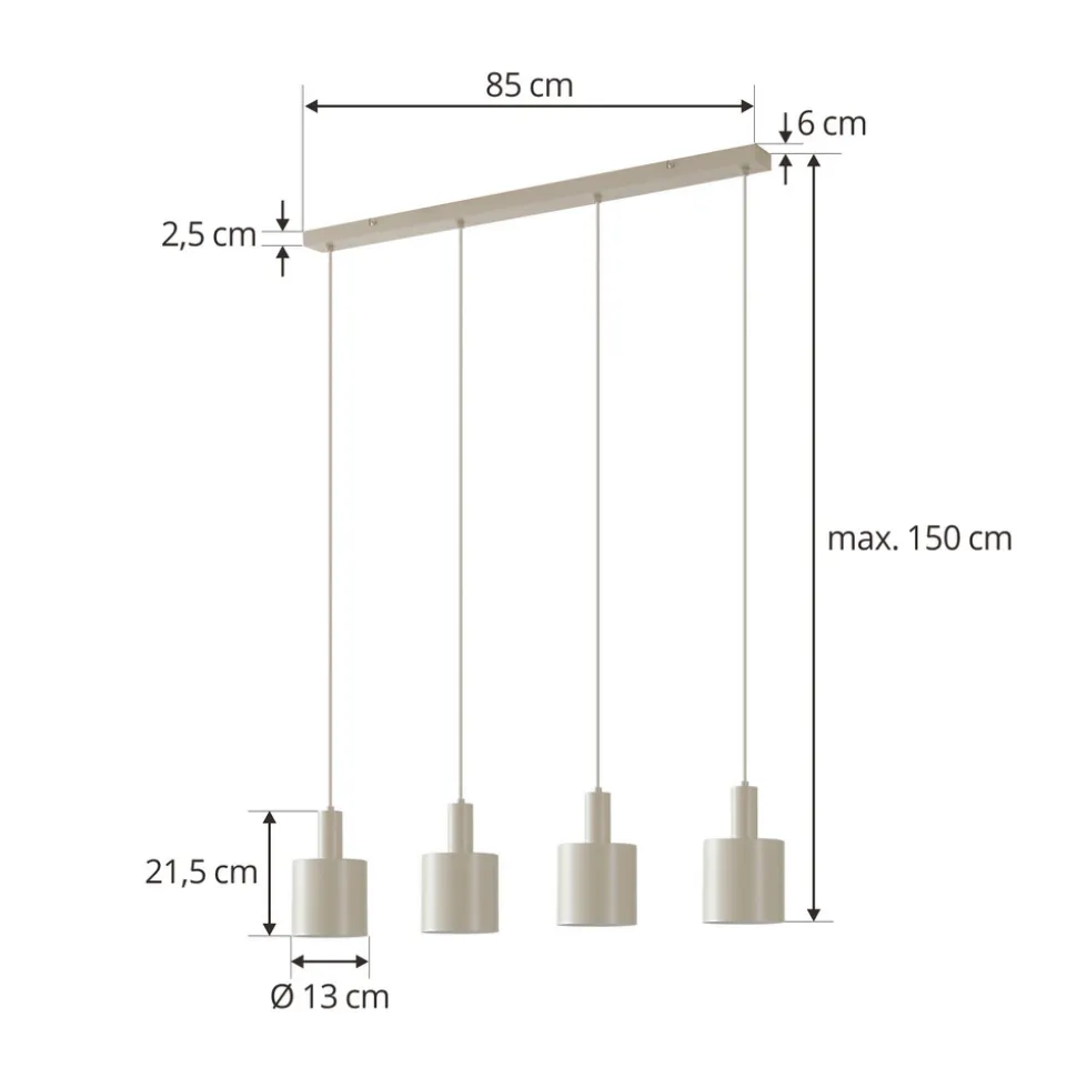 Ovelia 4 lyskilder hengelampe i beige Ovelia hengelampe er ideell til å lyse opp et spisebord eller et stuebord. Den er laget av jern og består av en langstrakt baldakin og fire skjermer. Pendellampen er helt beige i fargen og passer derfor diskret inn i en rekke ulike miljøer. Lyset reflekteres av den hvite innsiden av skjermene og spotlighter mot gulvet.