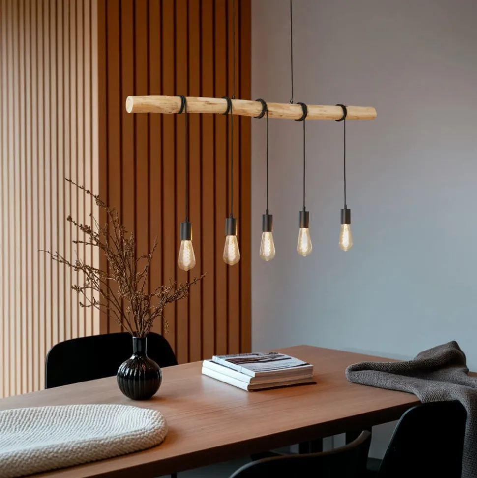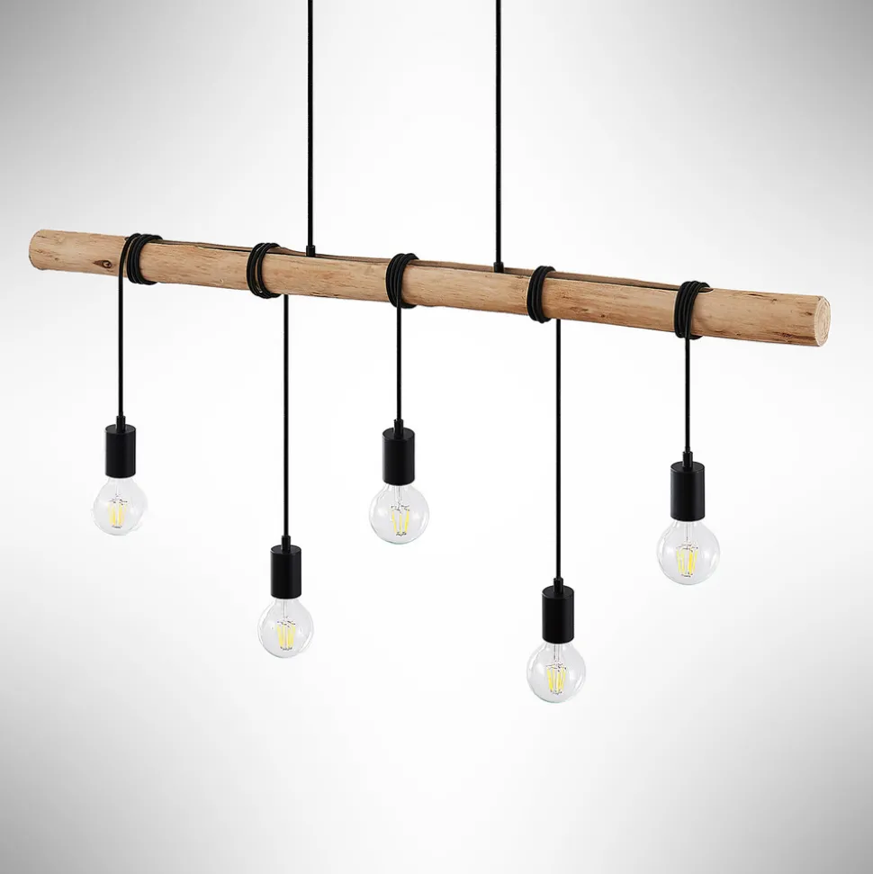 Rome pendellampe med vintage-look Rome pendellampe kjennetegnes av en lys og moderne design. Lampen består av en trebjelke som det er festet fem kabler til, hver med en fatning. Ettersom det ikke følger med noen pære i leveransen, kan disse velges fritt. Vær nøye med å velge en pære med glødetråd, da det nostalgiske pæreutseendet understreker armaturens vintageutseende.