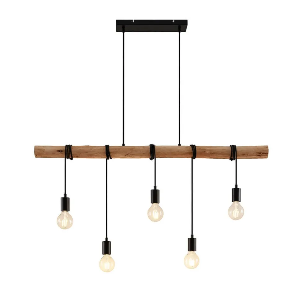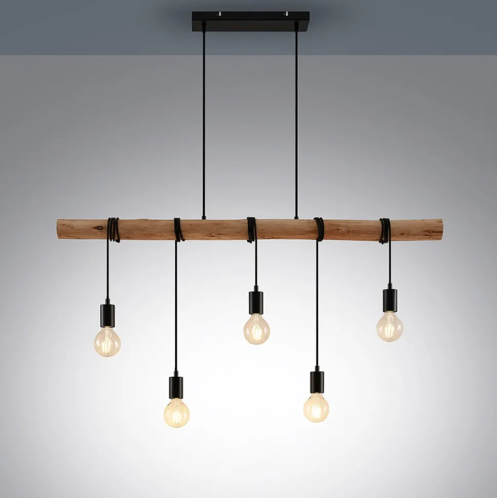 Lindby hengelampe Rom, 5 lyskilder, tre, tau, svart, 116 cm