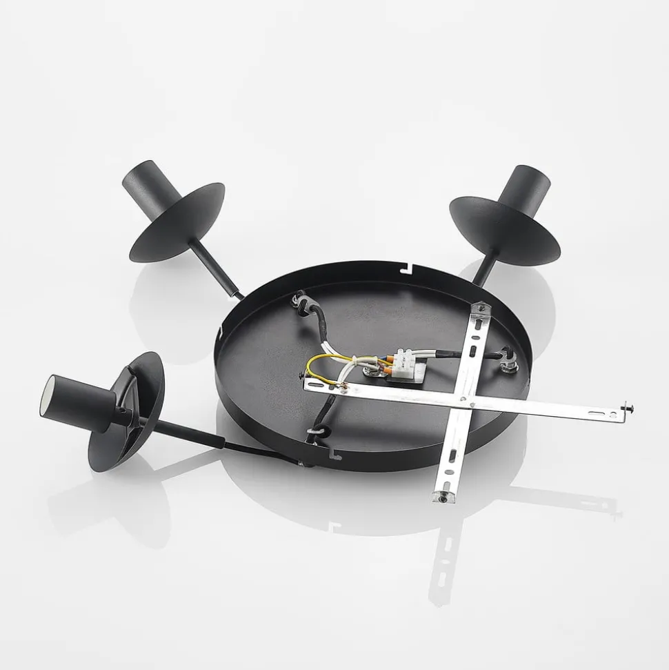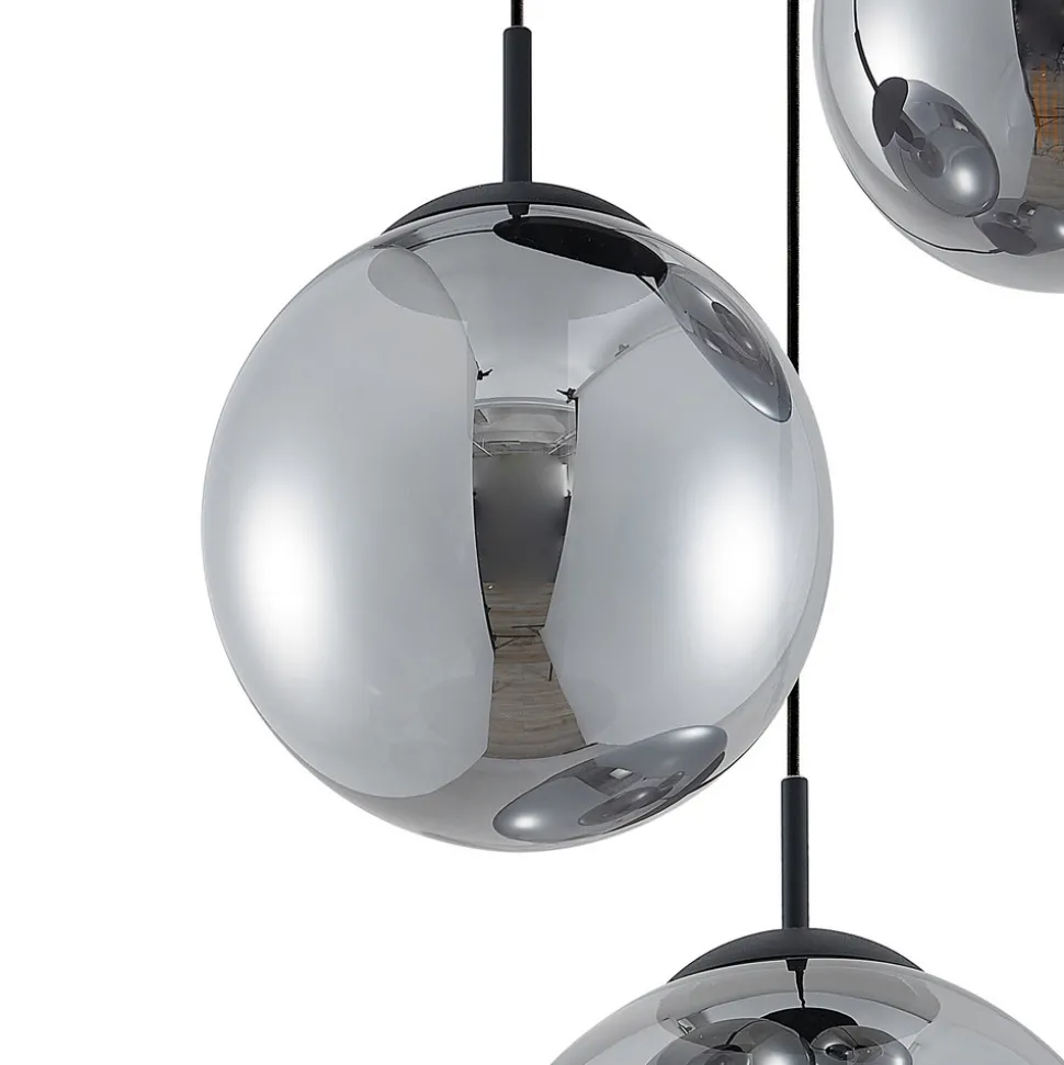 Teeja pendellampe med 3 lyskilder og glasskuler i røykgrått Teeja passer godt inn i moderne interiør, men har også en viss vintagesjarm med sine røykgrå kuler. Disse er laget av klart glass og er derfor relativt gjennomsiktige, noe som kan ses både når lyset er slått på og av. Derfor bør man bruke dekorative lamper som på en stilfull måte understreker helhetsinntrykket av hengelampen, for eksempel filamentpærer eller rustikkpærer, som er designet i stil med gamle glødepærer, men som vanligvis har effektiv LED-hengelampe. Pendellampen er en elegant lyskilde i oppholdsrommet og kan for eksempel brukes ved spisebordet eller sofabordet. Kulene henger ned fra den svarte takplaten i ulike høyder, noe som gir et spesielt dynamisk og individuelt uttrykk.